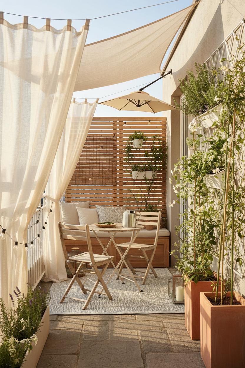 Tie it all together with pieces that pull double duty. A folding bistro set keeps the footprint nimble and stashes away in seconds when you’re hosting; a compact storage bench hides cushions and gardening tools while offering extra seating. Ground the scene with an outdoor rug to define your zone and add that “finished room” feeling—even on a balcony, it’s the quickest balcony decor upgrade. Finish with light-toned textiles, a few reflective accents, and a fresh plant palette, and you’ve got a patio makeover that reads serene rather than crowded. The trick is editing: choose a few hardworking elements—sheer panels, a vertical planter, string lights—and let negative space and sunshine do the rest.