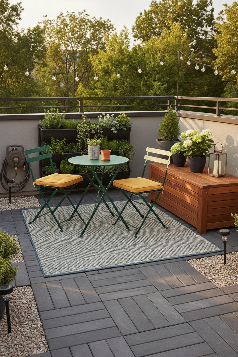 When you’re dreaming up an outdoor oasis that actually lasts through sun, rain, and busy weeks, lean into materials and pieces that work harder than you do. Start from the ground up with surfaces that shrug off weather—think porcelain pavers, composite deck tiles, or pea gravel framed with pavers—then layer in an outdoor rug woven from polypropylene so spills and showers are no big deal. For seating, a powder‑coated folding bistro set is the MVP of small patio ideas: it resists rust, wipes clean in seconds, and tucks away when you need floor space for yoga or a plant-potting moment. If you crave something cushier, choose quick‑dry foam cushions in UV‑resistant fabrics (Sunbrella-style) so they won’t fade or mildew after a summer storm.