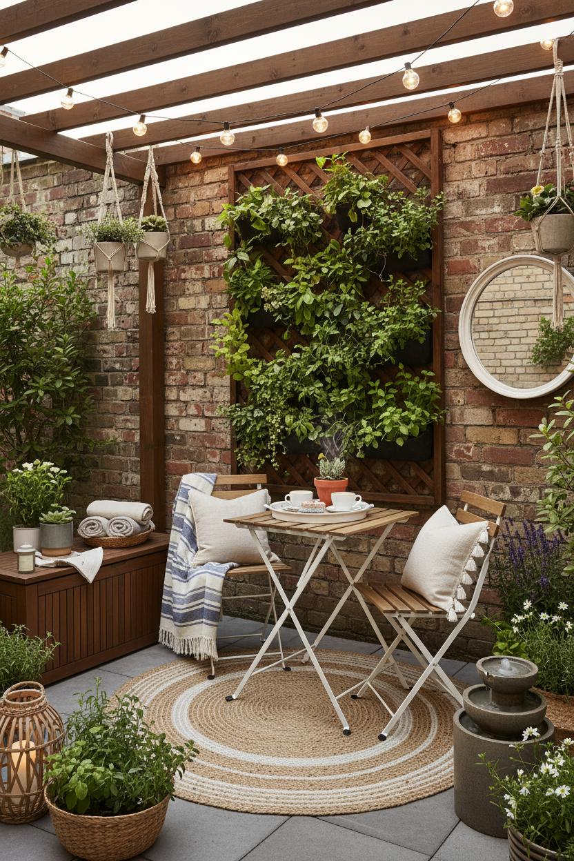 Let plants do the prettiest work. A vertical planter turns a blank wall into a living screen and is one of my favorite small patio ideas because it climbs up, not out. Mix trailing herbs, petite ferns, and a flowering vine so the texture feels lush in even the tiniest footprint. Tall grasses or dwarf bamboo in slim planters add movement and a soft rustle that muffles street noise—perfect for a tiny outdoor space. At night, weave outdoor string lights through the trellis or along a railing so the whole corner twinkles like a boutique café. Keep bulbs warm white for flattering, candlelit vibes that transform your setup into an outdoor oasis without losing that open, ethereal feel.