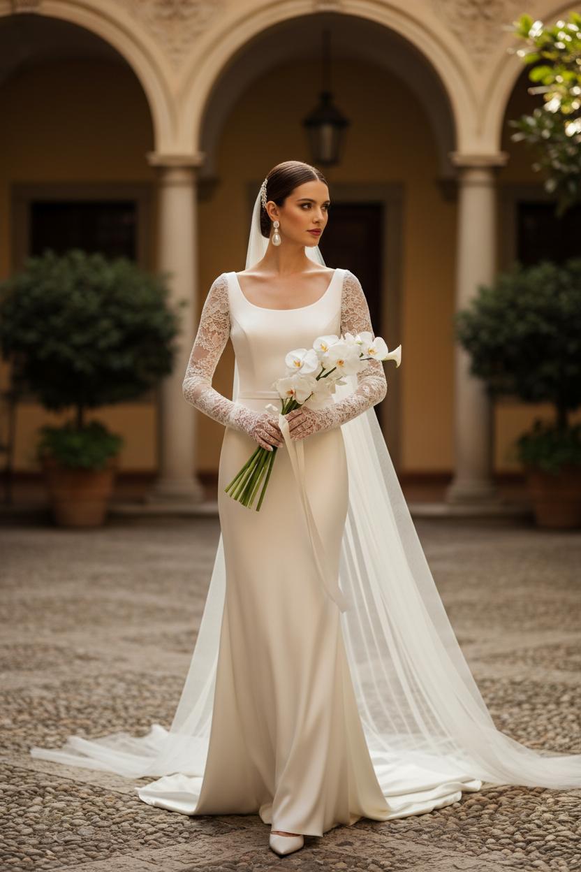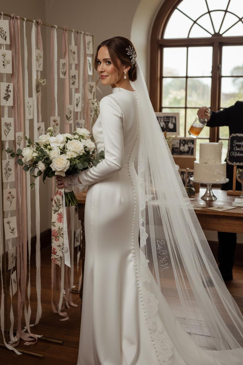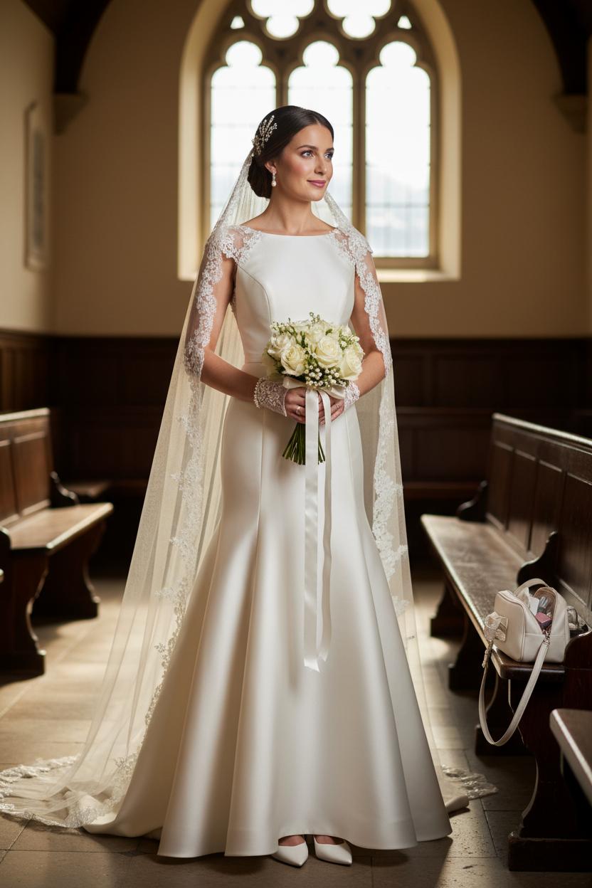 Begin your look with the foundation that never goes out of style: a beautifully tailored silhouette. Whether you choose an A-line or sleek column, a satin wedding dress with clean lines, a modest neckline, and buttons trailing down the back channels the essence of timeless bridal looks. Opt for ivory or soft champagne, and let subtle texture—think delicate lace at the bodice or a quiet sheen—do the talking. If you’re leaning toward a vintage-inspired wedding, borrow details like covered buttons, dainty cap sleeves, or floral appliqués that feel heirloom, not costume. Finish the frame with a long veil that skims the aisle and catches the light in a soft, romantic blur; fingertip or cathedral lengths both whisper classic wedding style. Above all, perfect the fit: hems that hover, waistlines that sculpt, and boning that supports make an elegant bride feel effortlessly poised from the first look to the last dance.