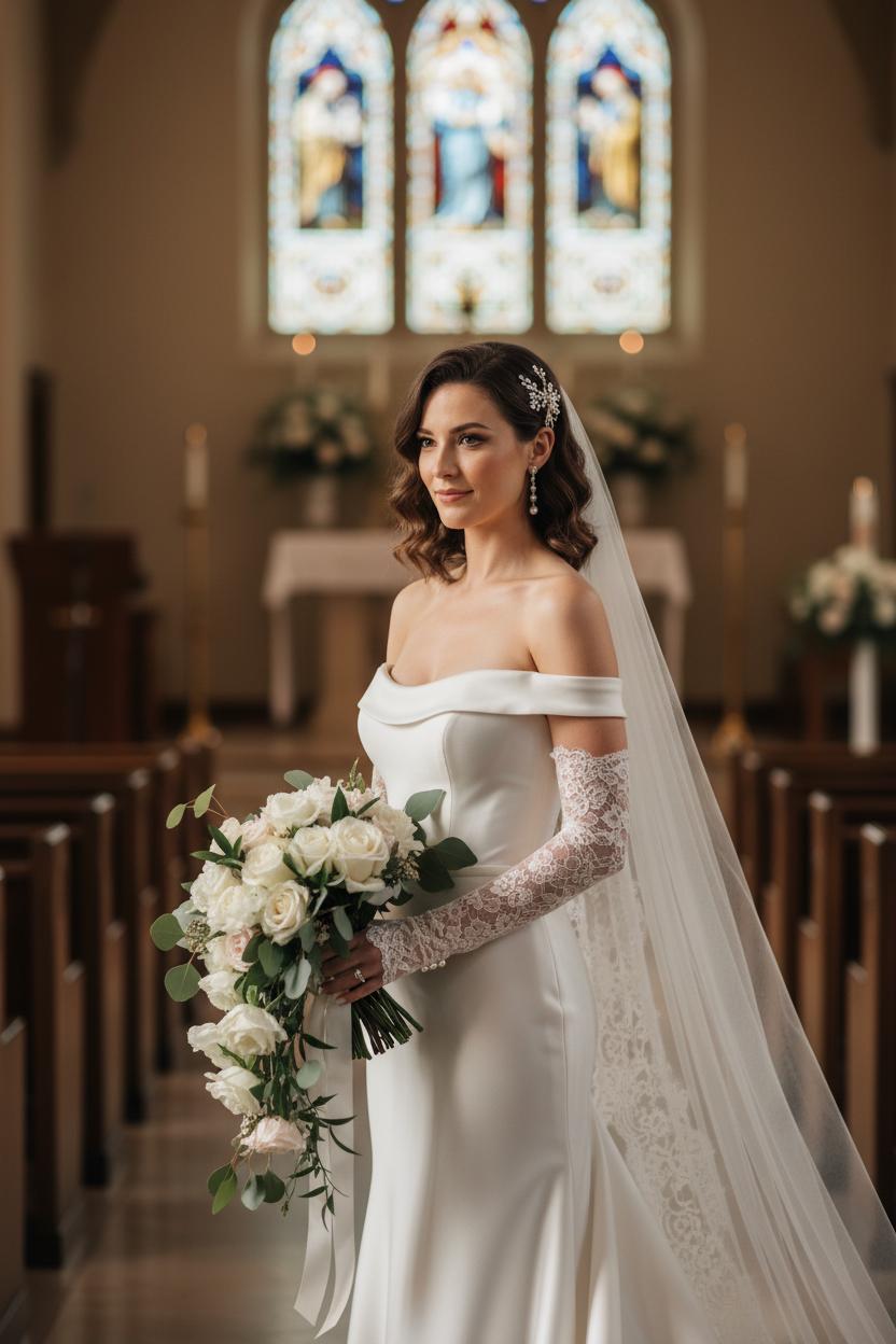 Winter calls for luminous glamour—picture candlelight on satin and elegant silhouettes against crisp air. A full-skirted satin wedding dress or tailored mikado sheath brings that heirloom sheen, complemented by a crystal-dusted bridal hair comb and a sweeping long veil for aisle drama. Add a velvet wrap or faux-fur stole for warmth and texture, and let pearl bridal earrings tie the look together. Keep the palette chic—ivory, champagne, and soft silver—and you’ll achieve classic wedding style that sparkles through the season.