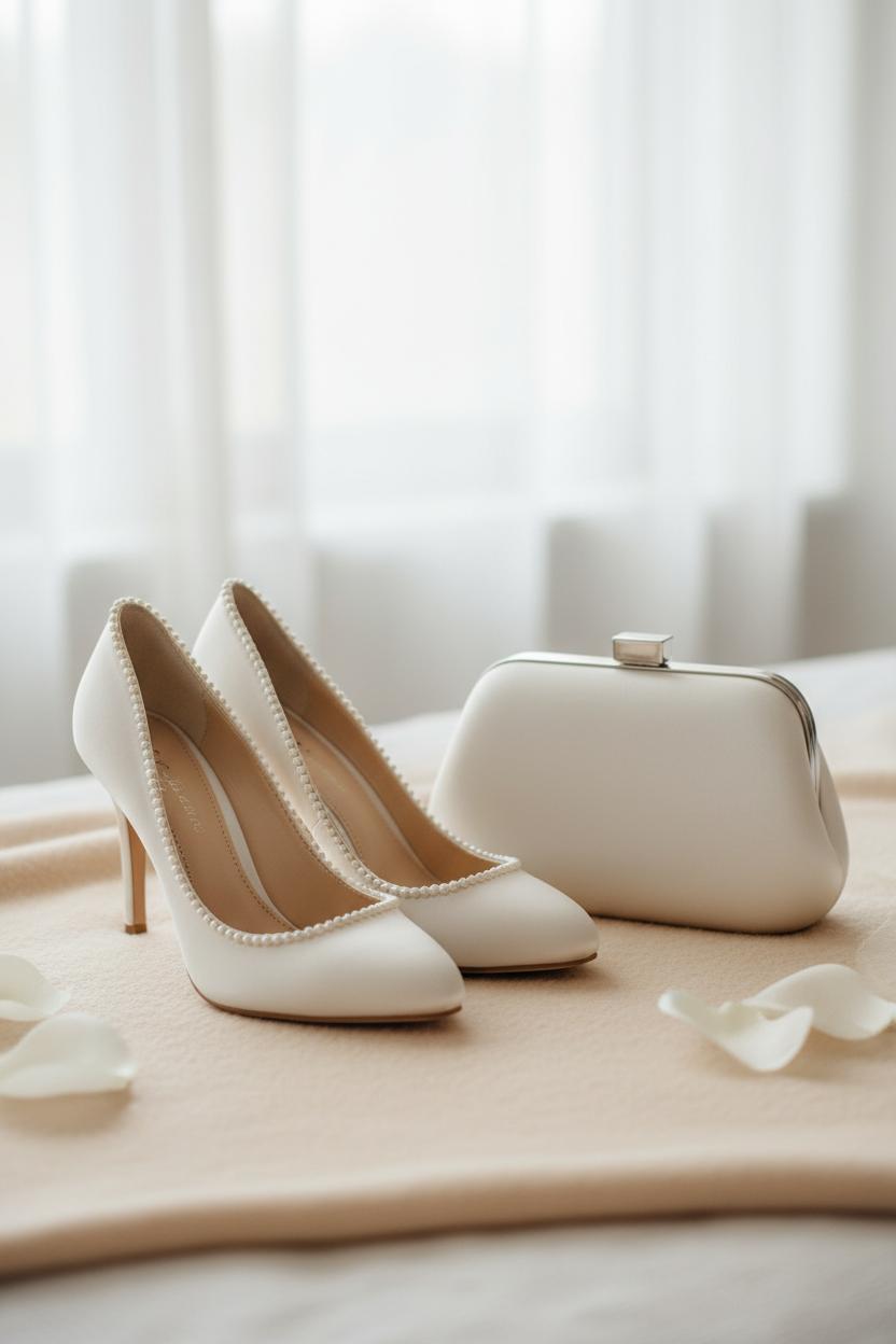 Your clutch is the polished bow on your ensemble—small, structured, and easy to hold in photos. A satin minaudière mirrors the dress in a quiet way, while a beaded or pearly box clutch adds texture you can feel without overwhelming the silhouette. For those leaning into a vintage-inspired wedding, a petite mother-of-pearl or art deco-inspired piece brings personality, but remember the “one hero” rule: if the clutch sparkles, keep your shoes clean-lined. Aim for a shade that melts into your gown or complements your bouquet tones, and tuck in the essentials: lipstick, blotting papers, and a tiny vial of fragrance.