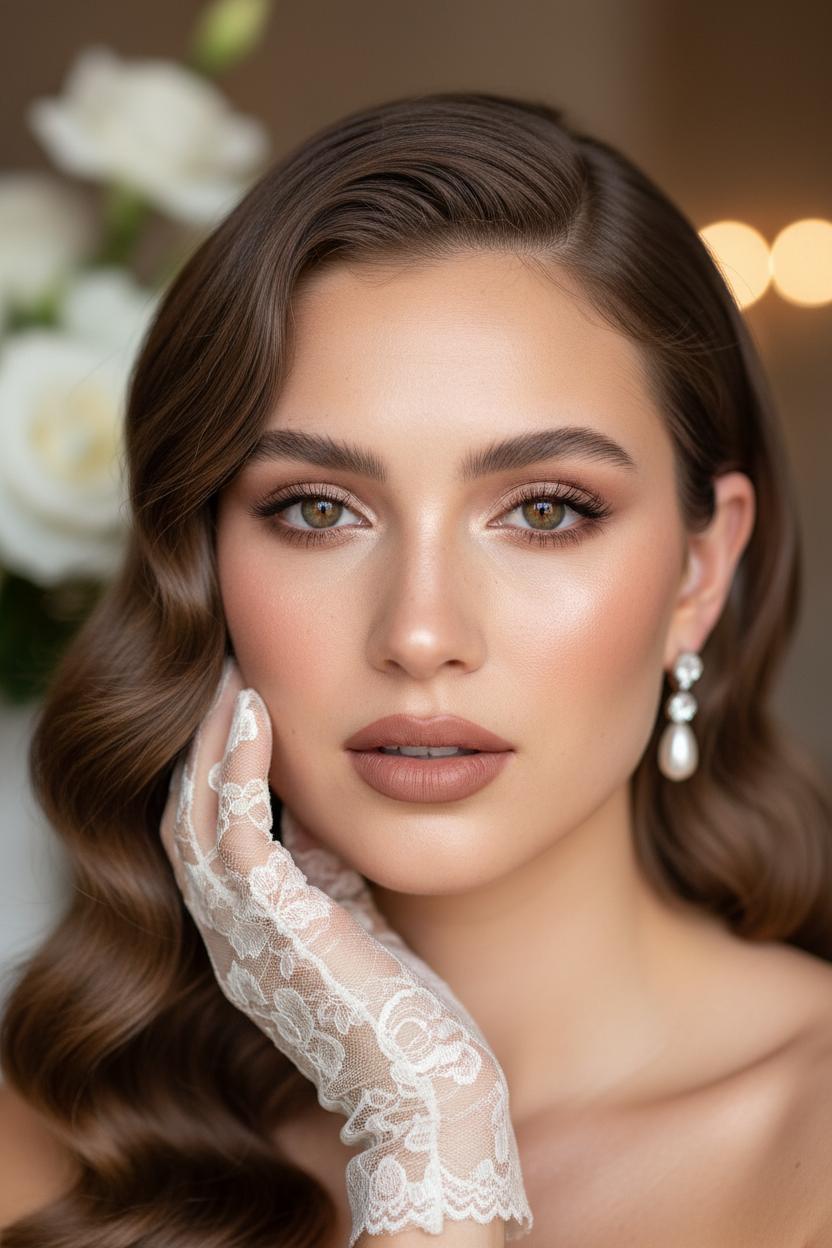 For hair, soft glam plays beautifully with polished textures and graceful movement. Loose Old Hollywood waves with a deep side part are forever flattering, especially when paired with pearl bridal earrings that catch the light with every turn. Prefer an updo? Try a low chignon with face-framing tendrils and tuck in a delicate bridal hair comb for a touch of sparkle beneath a long veil that spills down the aisle. A half-up style with subtle twists echoes romance without feeling fussy, and it pairs beautifully with a satin wedding dress that skims the silhouette. To lean into editorial bridal fashion, slip on lace bridal gloves for a chic nod to heritage—just the right dash of drama against luminous skin and a soft-focus makeup palette. No matter the combination, soft glam strikes that rare balance of refinement and ease, ensuring your beauty look complements, not competes with, the rest of your day—an approach that keeps your photos (and your memories) feeling beautifully, effortlessly timeless.