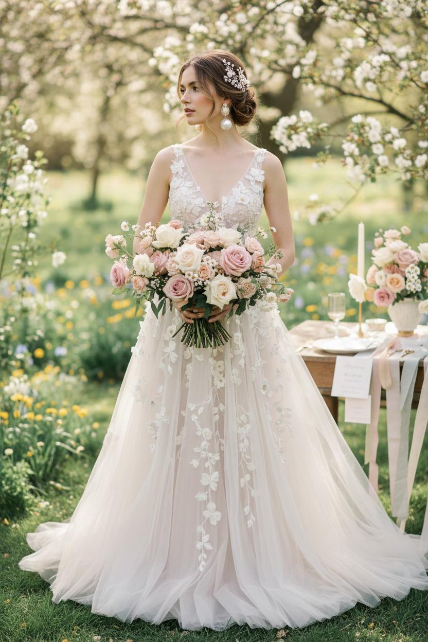 Spring is for softness and storybook romance, and a classic wedding style here means airy fabrics and delicate details that feel freshly picked from a garden. Think a refined A-line with floral appliqué, a whisper of tulle, and a rosy bouquet that looks effortless. Pearl bridal earrings bring a glow to the skin, while a floral bridal hair comb tucked into a loose, romantic bun hints at dew-kissed petals. For timeless bridal looks, keep makeup luminous and light, and let a subtle pastel palette carry through your invites, ribbons, and tablescape.