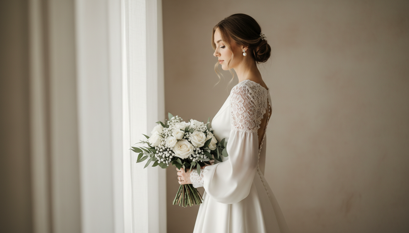Then cue the finishing touches that pull your bridal fashion story together. Choose pearl bridal earrings for a glow that flatters every complexion, and pair them with a delicate bracelet or a minimal pendant if your neckline invites it. If you love a little drama, lace bridal gloves add a graceful nod to heritage while keeping the overall mood refined. Tuck a bridal hair comb into a chignon or soft waves—mother-of-pearl, crystal, or tiny florals add shimmer without stealing the spotlight. Complete the ensemble with classic pumps or slingbacks, a bouquet of roses or lily of the valley tied with silk ribbon, and makeup that reads fresh and timeless: luminous skin, softly defined eyes, and a rosy lip. Keep nails sheer and polished, choose a signature fragrance that feels like you, and prepare an essentials kit with pins, blotting papers, and a touch-up lip. This is your compass for classic wedding style—quietly luxurious, deeply personal, and crafted to let you move, laugh, and glow like the most elegant bride in the room.