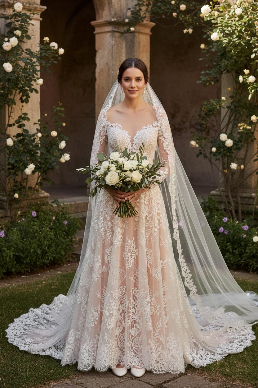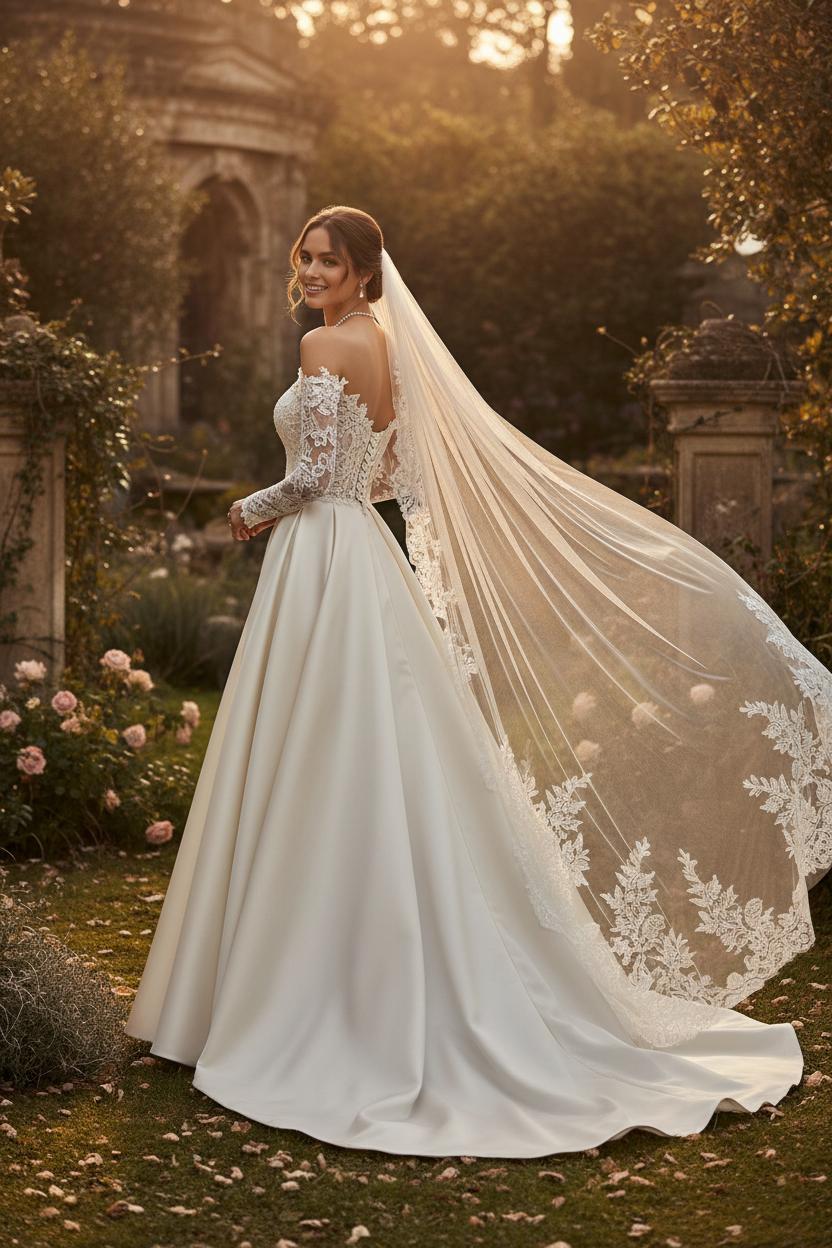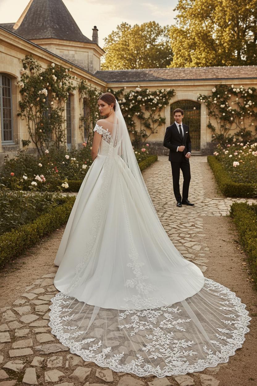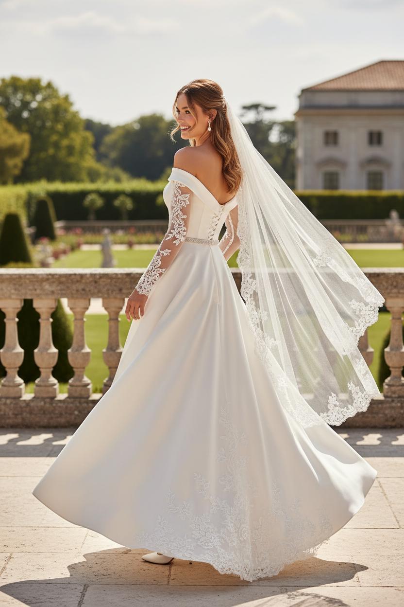 There’s something undeniably magical about the moment a cathedral veil is added—the entire look softens, lengthens, and suddenly feels cinematic. For brides drawn to elegant wedding gowns, a sweeping veil is the final brushstroke that brings the portrait to life. Let it trail behind a romantic A-line wedding dress for airy movement, or let it pool dramatically behind a sleek silhouette for a red-carpet finish. If you’re wearing an off shoulder wedding dress, a cathedral veil draped from a low chignon nods to Old World romance, while a veil pinned at the crown adds height and a regal line. Match the veil’s undertone—ivory, champagne, or soft blush—to your gown, and echo textures too: a delicate lace edge whispers back to a lace wedding dress, while clean silk tulle complements minimalist luxury bridal fashion. Tiny pearls, scattered crystals, or a whisper of embroidery can catch the light without stealing the show.