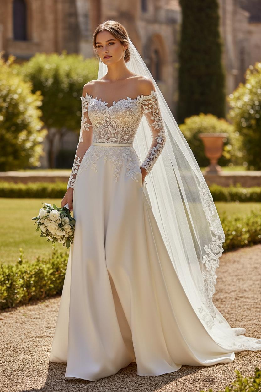 Necklines add romance and personality in a single glance. The sweetheart is a forever favorite, softening the décolletage with a petal-like curve, while an off shoulder wedding dress frames the collarbones for a luminous, old-Hollywood feel. Bateau necklines read refined and couture, especially with covered buttons and a dramatic train, and a deep V can feel modern yet poised when balanced with a fuller skirt. Illusion details—sheer tulle kissed with embroidery—let you play with coverage without losing delicacy. Picture any of these bridal dresses finished with a cathedral veil that trails behind like a whisper, catching the light and adding that ceremonial grandeur we all love.