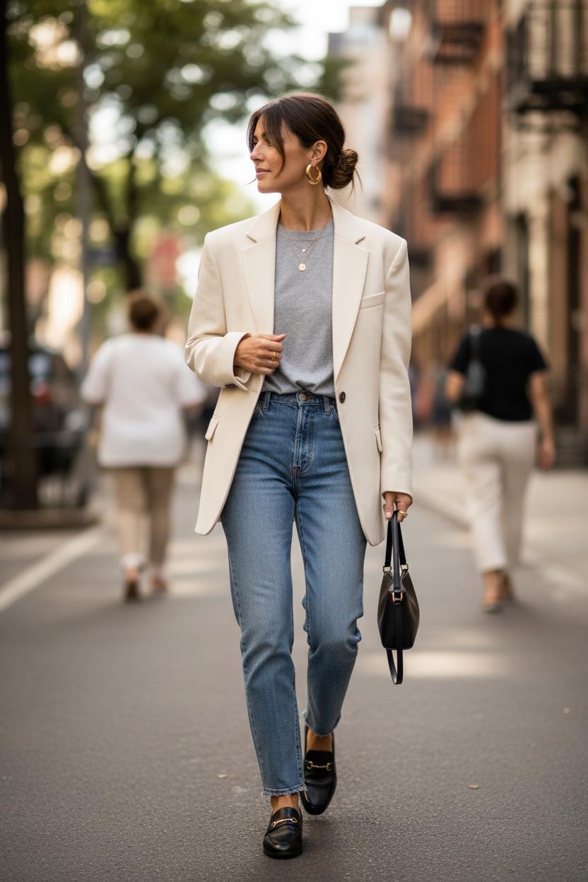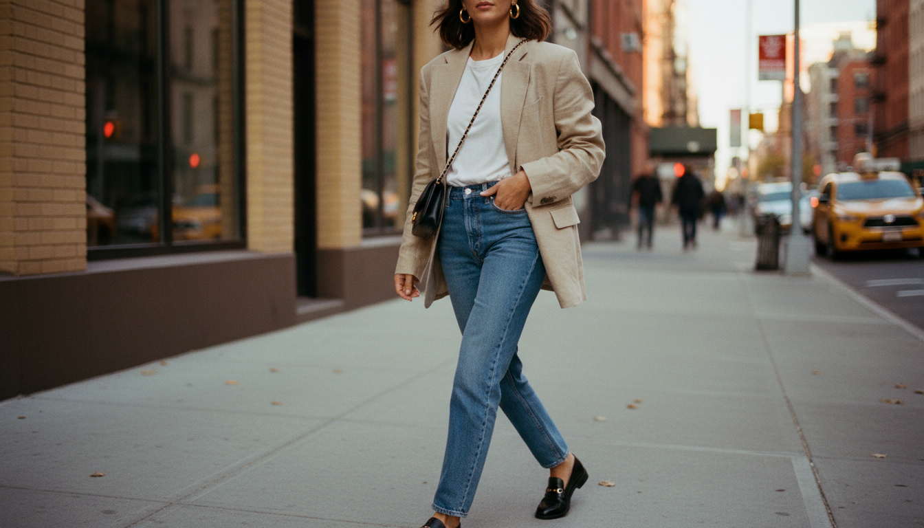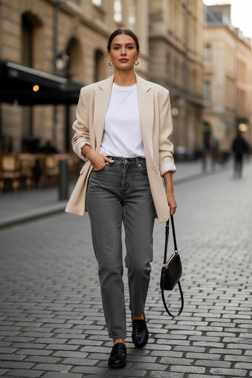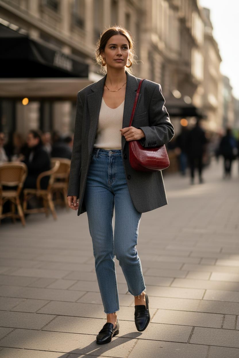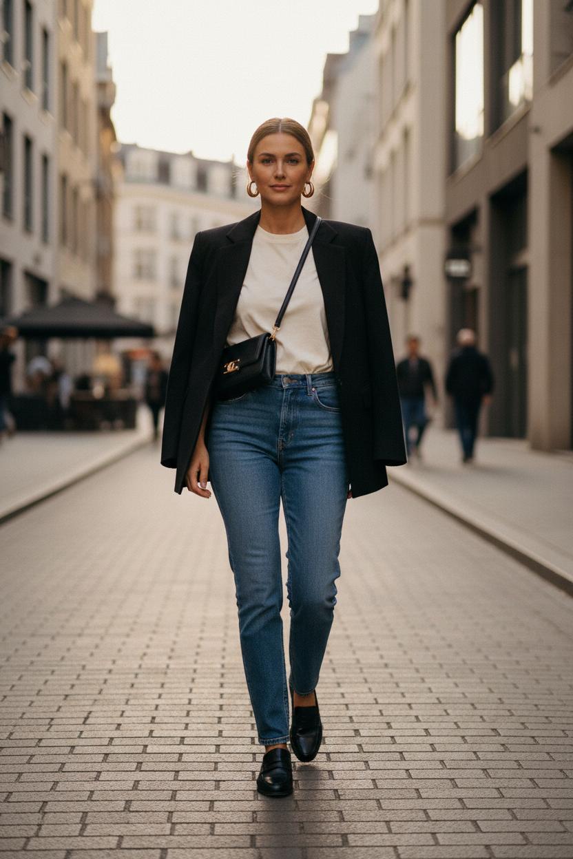 Accessories seal the vibe. A mini shoulder bag in black or espresso stays close to the body and feels modern, and a pair of gold hoop earrings adds that subtle glint that elevates the whole look. Keep the palette neutral—think oat, charcoal, navy, or deep olive—so everything plays well together, especially if you’re curating a capsule wardrobe. If you need a quick switch-up, swap the tee for a fine-knit sweater or a striped tank, add a leather belt, and slide on your loafers with textured socks when the breeze kicks in. For evening, push up the blazer sleeves, slick on a rosy lip, and you’re done. These outfit ideas work because each piece is quietly considered: the structured shoulders of the blazer sharpen the denim, the loafers refine without fuss, and the petite bag streamlines the silhouette. Minimal effort, maximum intention—proof that tailored ease is the secret to looking polished on the go.