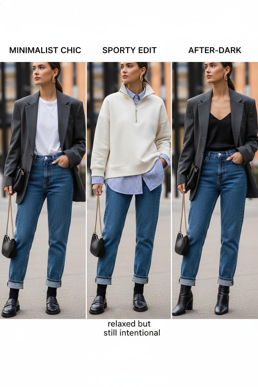 For after-dark, elevate the denim with a silky camisole or a one-shoulder knit, then bring back the oversized blazer for a tailored finish. Keep accessories sleek: a mini shoulder bag under your arm, gold hoop earrings, and either heeled boots or, for a fashion insider move, the same black loafers. The contrast between sharp tailoring and laid-back denim gives this street style outfit a quietly luxe feel. Straight leg jeans become the constant in a rotation of trendy looks, proving that a smart capsule wardrobe doesn’t need a lot—just the right pieces styled three ways, on repeat.