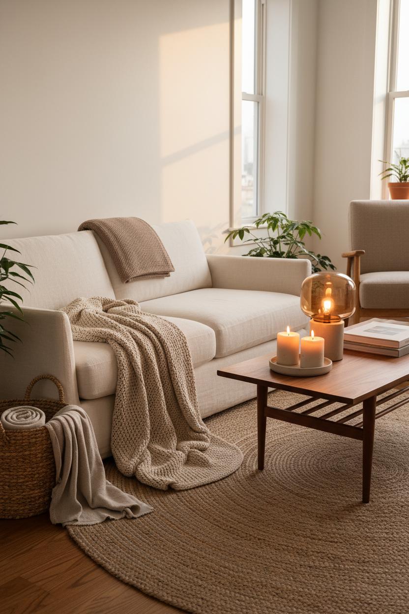 Start by curating a color story that whispers rather than shouts—think creamy whites, oatmeals, soft greige, and warm caramel accents—so your cozy living room instantly feels grounded and welcoming. This is the heart of a warm apartment aesthetic: layered textures, dimmable lighting, and materials that look better the more you live in them. Roll out a jute area rug to add earthy depth underfoot, then drape a neutral throw blanket over the arm of your sofa for an effortless, touchable layer. Sprinkle in wood tones—walnut frames, a simple console, even a woven tray—to warm up your neutral decor without adding visual noise. Lighting matters so much here: trade harsh overheads for pools of glow with an amber glass lamp on a side table, then add a floor lamp in a corner to soften shadows. A ceramic candle set brings that flicker and a gentle scent—instant hygge home vibes that make the room feel like it’s giving you a hug.