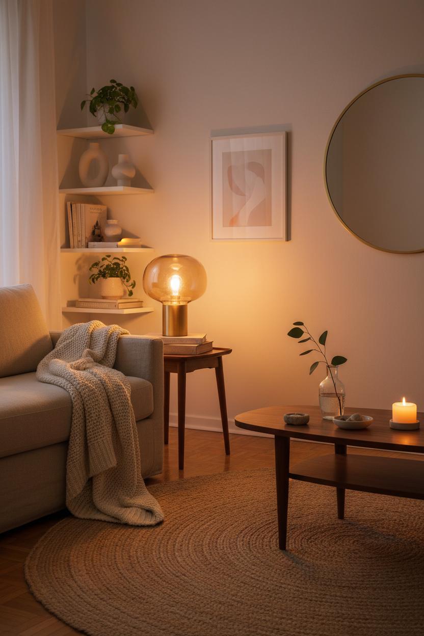 There’s something about an amber glass lamp that makes a room exhale. Switch it on and suddenly the walls feel closer in the best way—like golden hour decided to move in. For a warm apartment aesthetic, let that soft, honeyed glow spill across your neutral decor: a linen sofa draped with a neutral throw blanket, a jute area rug underfoot, and the gentle curve of a mid-century coffee table catching the light on its wood grain. I love placing the lamp on a slim side table beside the sofa so the glow grazes a stack of well-loved books and a ceramic candle set; the warm tones echo each other and turn the corner into a cozy living room vignette. If your space is petite, think vertical—style the lamp on a narrow console or bookshelf where it can cast light through the shelves, creating little pockets of ambience without crowding your floor plan.