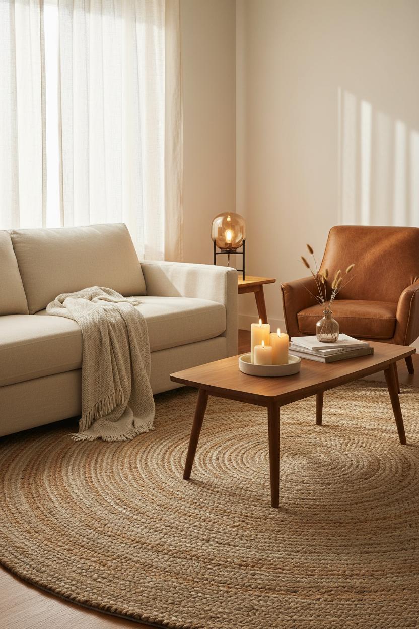 For styling, choose a size that lets at least the front legs of your seating sit on the rug; it immediately pulls the layout together and is one of my favorite small space ideas for making a room read larger. A mid-century coffee table with tapered legs looks especially lovely against the nubby weave, the curves and wood tones playing off the natural braid. Keep the palette cohesive with a neutral throw blanket draped over the sofa and a soft, amber glass lamp on a side table—the warm glow over jute is magic at dusk. Tuck a ceramic candle set on a tray for an extra flicker of coziness, and you’ve got layers of light that make evenings feel intimate without visual noise. Practical notes: a rug pad will add plushness and protect the fibers, and a quick weekly vacuum keeps the texture crisp. Jute is beautifully low-key, but it still reads elevated, anchoring the room in a way that feels fresh, unfussy, and perfectly suited to a neutral decor lover’s everyday life.