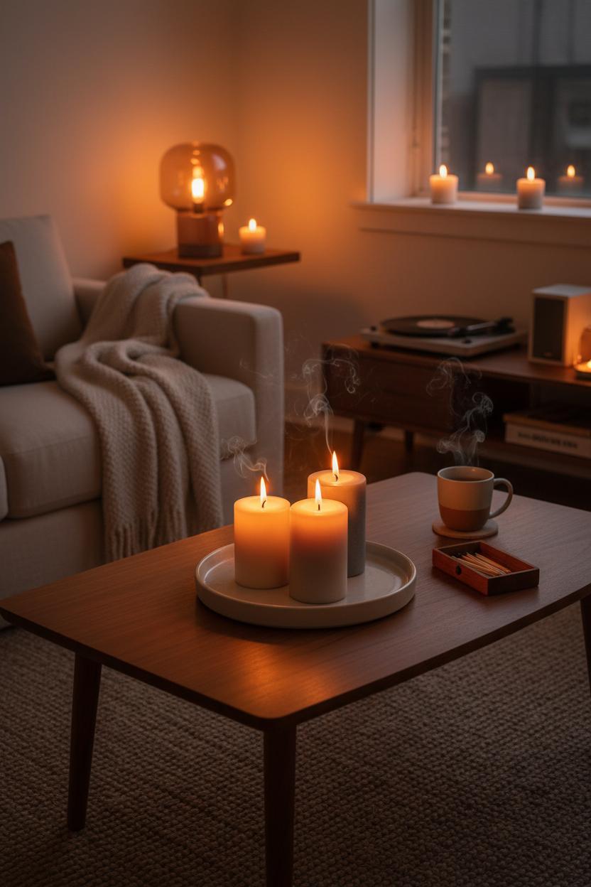 In a smaller space, thoughtful placement is everything. Corral your ceramic candle set on a round tray to keep things tidy and renter-friendly, then stagger heights for a soft, sculptural moment that doesn’t overwhelm. Tuck a single votive on a shelf near your reading nook or line two along a windowsill (always heat-safe and away from drafts) to stretch the glow without crowding surfaces—simple small space ideas that still feel luxurious. Trim wicks, light at dusk, and let this tiny, repeatable ritual anchor your hygge home: tea steaming, playlist hum low, blanket within reach. Bonus points for sustainability—when the wax is gone, repurpose the ceramic cups as bud vases, pen pots, or a chic place to stash matches. Rotate fragrances with the seasons (herbal in spring, airy florals in summer, woods and smoke when the air turns crisp) so your cozy living room subtly shifts mood right along with you. The beauty of a well-chosen set is how effortlessly it blends with your existing pieces—an amber glass lamp here, a jute area rug there—quietly elevating the room until everything feels warm, intentional, and wonderfully yours.