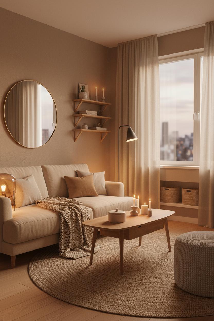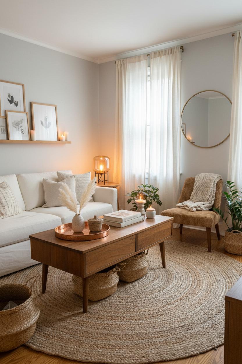 When you’re working with a petite footprint, start by thinking in gentle zones rather than strict room divisions. Float your seating just a touch off the walls to give the space a breathable edge, then anchor everything with a jute area rug that defines the conversation area without feeling heavy. Choose a mid-century coffee table with slim legs or soft, rounded corners to keep the visual flow moving; it’s amazing how curved lines invite you to relax and help traffic glide past. Keep pathways at least a couple of feet wide, let your curtains hang high and wide to lift the eye, and bounce light with a simple mirror so your cozy living room feels expansive by day and cocoon-like by night. A small cluster of layered lighting—an amber glass lamp for glow, a discreet floor lamp for height, and a few candles—creates that warm apartment aesthetic that turns everyday moments into little rituals.