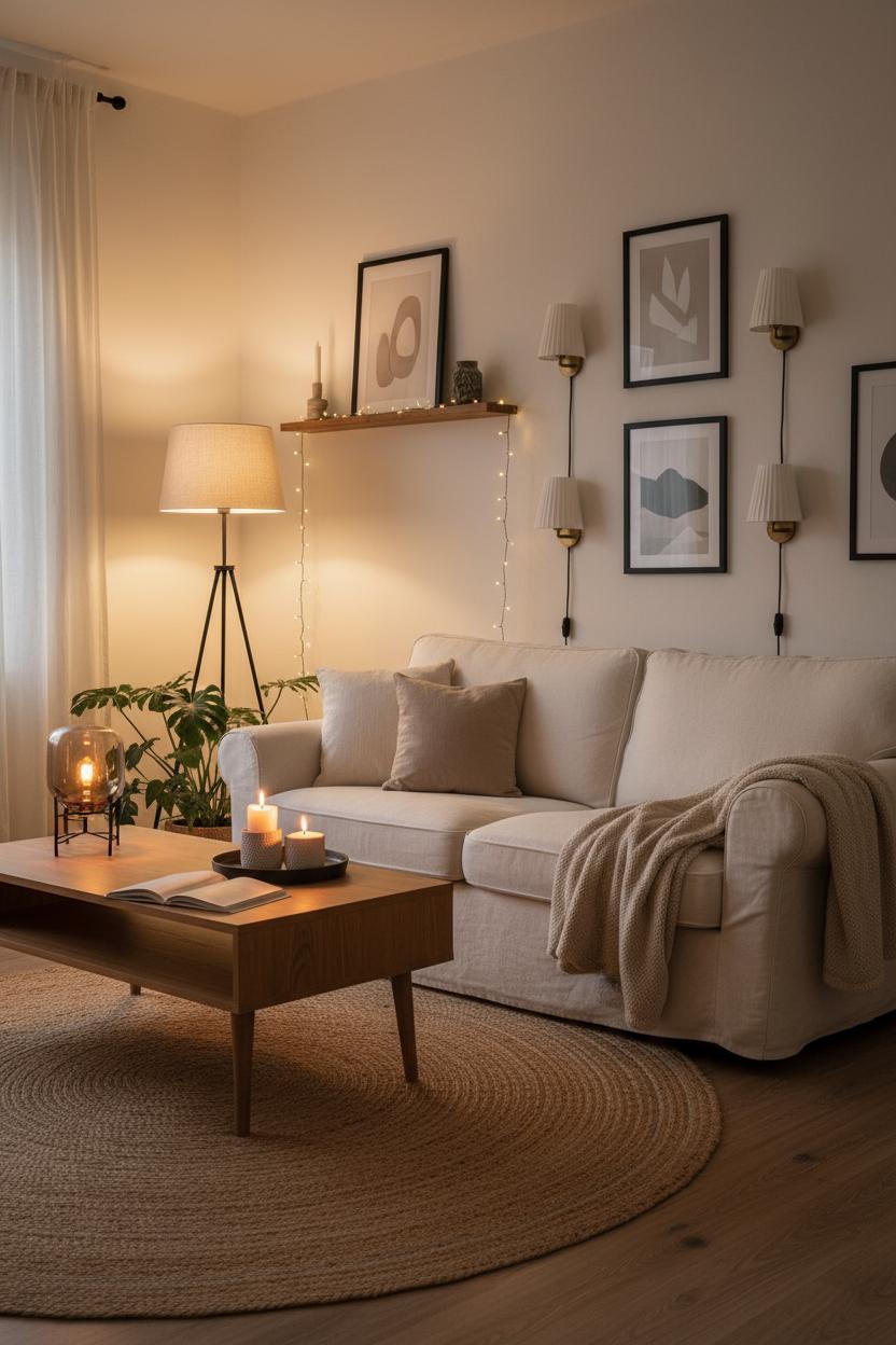 Lighting is the quiet storyteller in a cozy living room, and layering it—task, ambient, and accent—is how you get that golden, candlelit hush that defines a warm apartment aesthetic. In a space built on neutral decor, the right mix of glows brings depth and dimension so the room never feels flat. Think of it like styling textures: you want a balance of soft and focused, bright and dusky, so every corner invites you to linger. Even in a studio or petite sitting area, layering light turns square footage into feeling, which is the heart of a true hygge home.