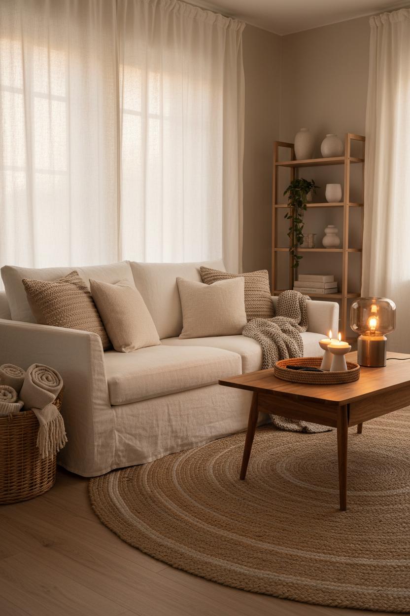 As days get brighter, pare everything back. Swap the heavy knit for a gauzy throw and lighten the floor with a breezy jute area rug that brings in organic texture without visual noise. Refresh the room with citrus or herbal notes from a ceramic candle set, and let a vase of leafy branches carry the moment. Rotate in lighter pillow covers, clear a shelf or two, and let negative space breathe—neutral decor really shines when there’s room around it. Keep lighting soft but fresh: that same amber glass lamp feels summery paired with sheer curtains and afternoon sun. The goal is a warm apartment aesthetic year-round—simple, sensory, and serene—achieved with thoughtful seasonal switches that take minutes, fit small space ideas beautifully, and keep your hygge home grounded in ease.