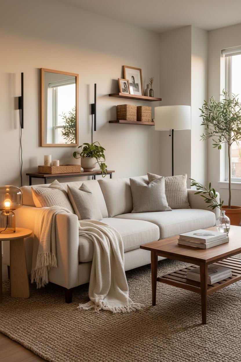 If you’re working with a compact footprint, let your styling double as smart small space ideas. Choose a mid-century coffee table with a shelf or hidden compartments, and style it with a small stack of books and a single bud vase to keep things airy. Use vertical real estate: slim wall sconces, a narrow leaning mirror to bounce light, and floating shelves that hold baskets for toss-and-go storage. Keep decor tonal and tactile—linen, bouclé, rattan—so the room feels layered, not busy. Add life with a trailing plant or a petite olive tree; the green reads as neutral but fresh. Edit often: a few beautiful pieces, well-placed, make a bigger impact than clutter. As the sun sets, switch on that amber glow, tuck your feet under the throw, and strike a candle—your cozy living room transforms, proving that a warm apartment aesthetic isn’t about perfection; it’s about consistent, comforting details that make coming home the best part of your day.