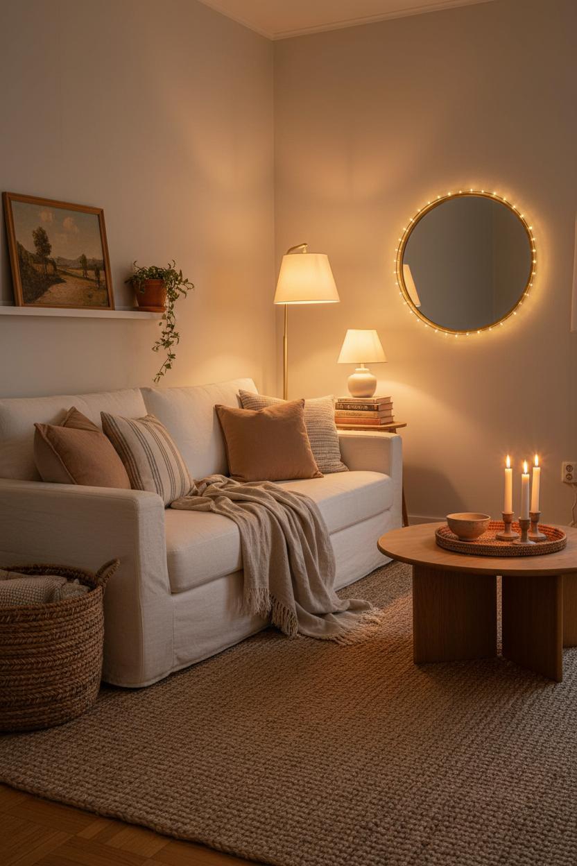 Bring it all together: choose a neutral living room base, layer textures, and let ambient lighting glow from lamps, candles, and warm bulbs. In a small space styling mindset, think multifunctional pieces, soft rugs, and airy curtains to keep things calm yet cozy. The warm apartment aesthetic thrives on restraint—creamy tones, natural materials, and personal touches that feel collected, not cluttered. Edit often, dim the lights, and spotlight what you love. With these cozy home decor moves, your space will feel inviting morning to midnight—proof that the gentlest details create the deepest comfort.