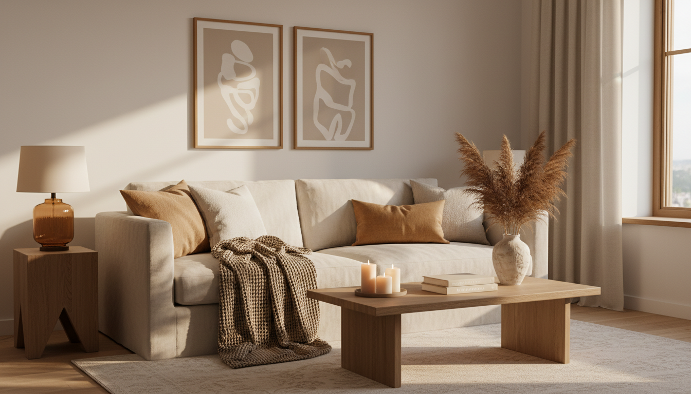 In the living room, lean into cozy apartment decor with layers you can sink into. Ground the seating with a textured rug and repeat soft neutrals: linen pillow covers on the sofa and a neutral throw blanket at the ready for movie nights. Mix wood, ceramic, and woven pieces so your neutral home decor looks collected, not flat. Warm up corners with an amber glass lamp to dim the room into that golden, hygge living mood, and corral remotes inside a lidded box atop a stack of favorite books. A vase of faux pampas grass or seasonal stems adds height without maintenance, while a rattan basket by the sofa keeps extra throws and magazines within reach.