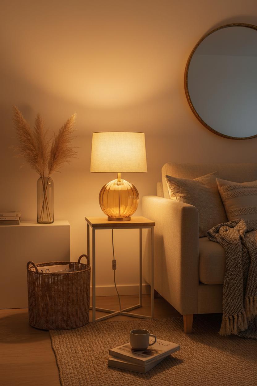 Small space design tip: scale and placement are everything. A lamp with a slim base and rounded glass feels airy, so it won’t crowd a petite side table. Tuck it into a darker corner to brighten dead space, or set it beside a mirror to amplify the glow without adding another fixture. Hide cords neatly inside that rattan basket and keep surfaces edited so the light can be the star. When the sun dips, switch on the amber glow, pile under your throw, and let the room exhale. It’s a tiny ritual that reads hygge living in the best way—calm, intentional, and beautifully simple—turning everyday moments into the kind of cozy you’ll want to come home to.