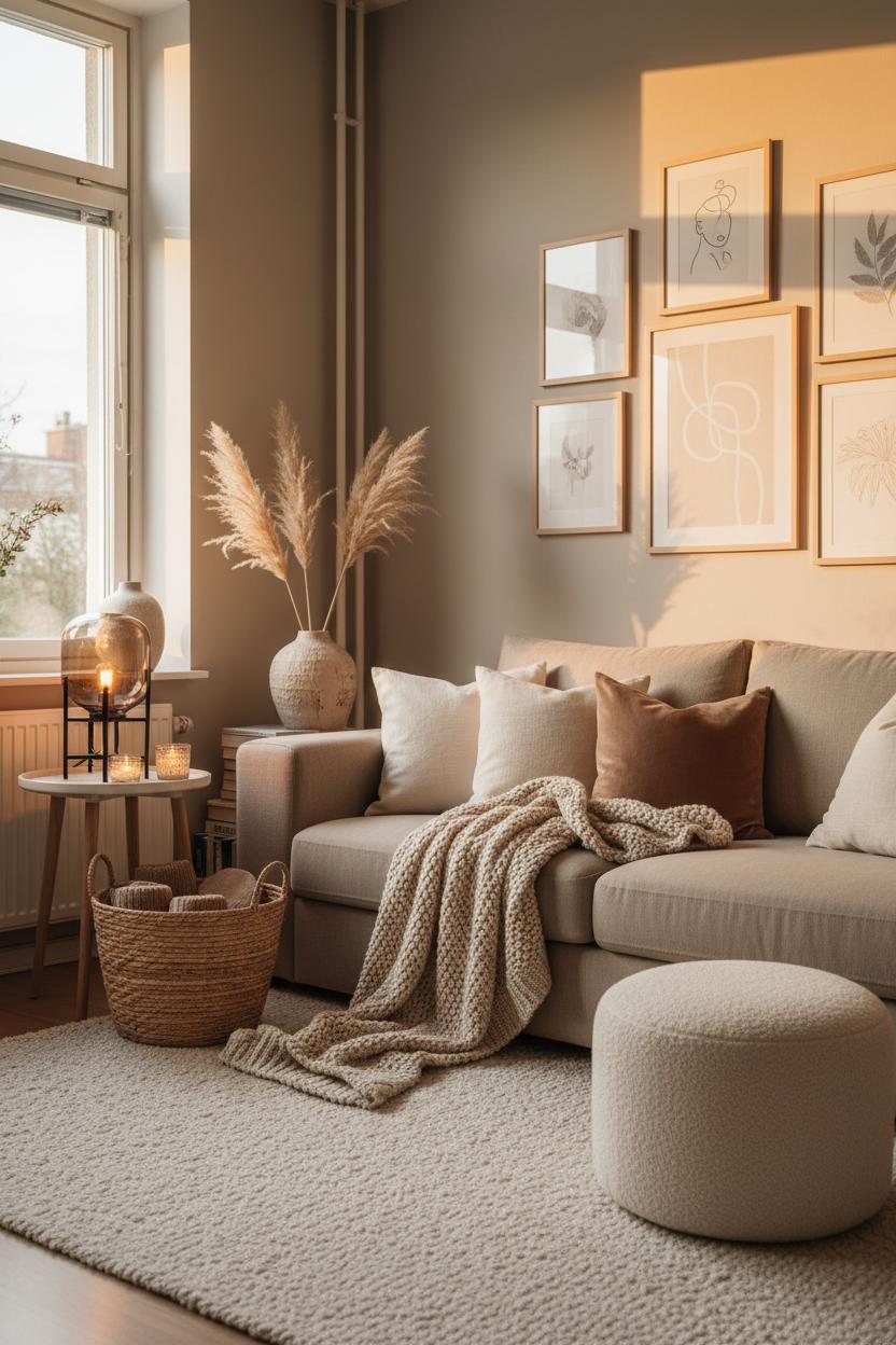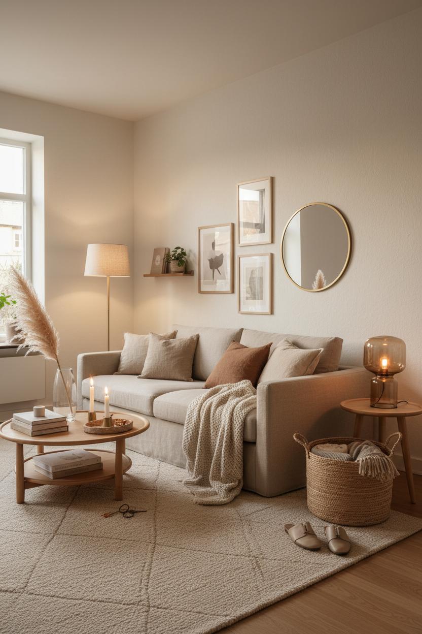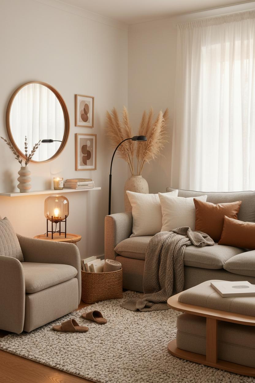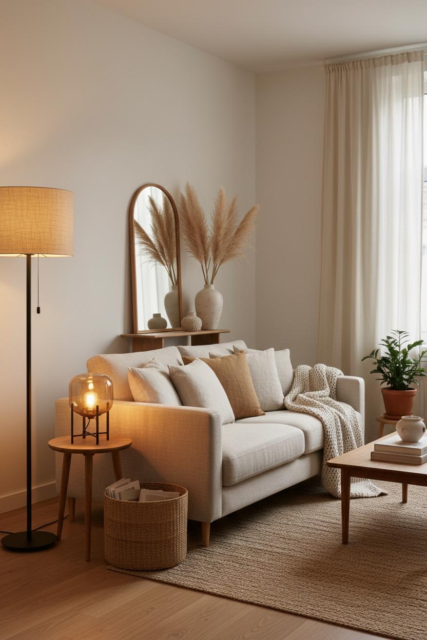 Layering comfort without clutter starts with a soft, simplified palette. Think creamy whites, warm caramels, and sandy taupes—the kind of neutral home decor that instantly calms your eye and creates that warm apartment aesthetic. Keep your base pieces quiet: a textured rug underfoot, a sofa dressed in linen pillow covers, and a neutral throw blanket folded at the ready. Then add warmth in small, thoughtful doses: an amber glass lamp casting a golden glow at dusk, a ceramic vase with a few stems of faux pampas grass for airy height, and a wooden tray to corral remotes and matches. In small space design, scale matters as much as quantity. Choose slimmer silhouettes, legs that lift furniture off the floor, and a few taller elements to draw the gaze up—curtains hung high, a lean mirror, or pampas plumes that graze the ceiling. This is hygge living by design: layers of texture, pockets of light, and just enough negative space to let each piece breathe.
