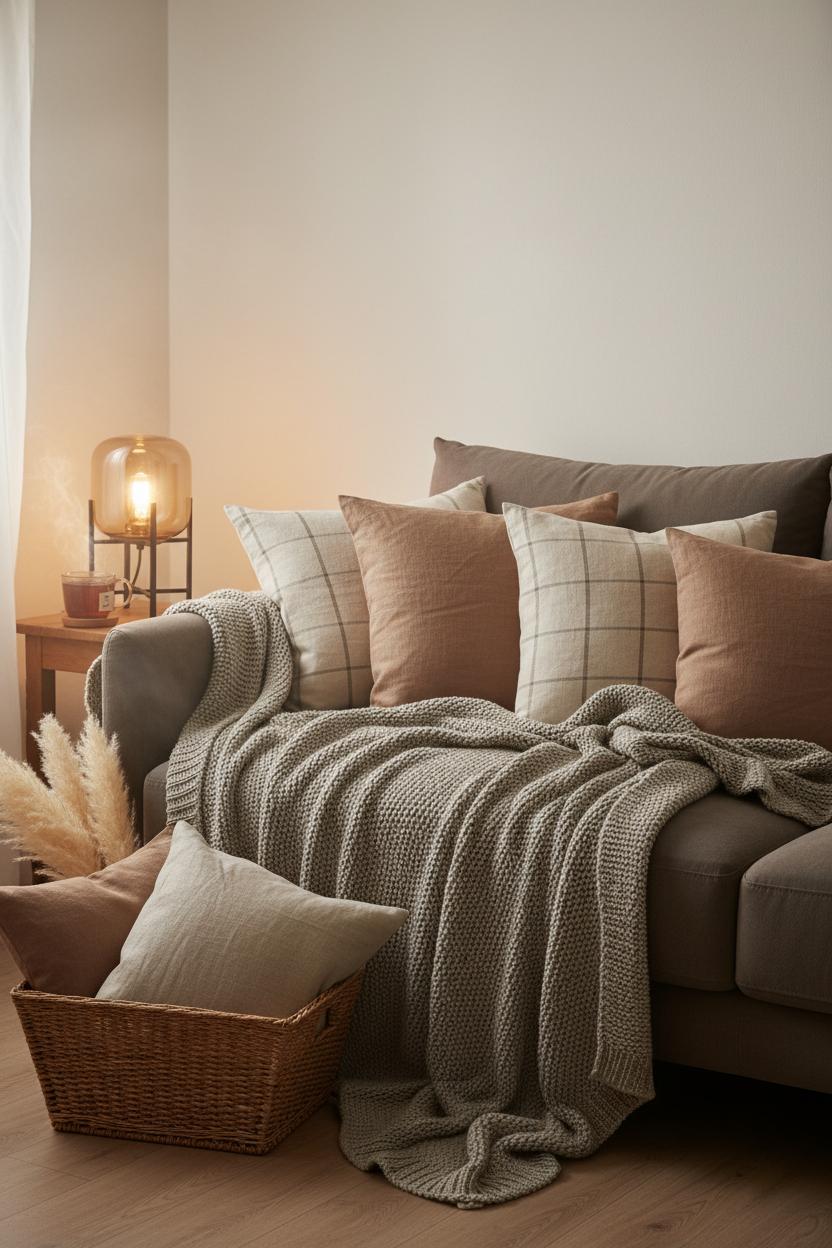 Then anchor the scene with a neutral throw blanket, the kind you can drape over the arm of a chair or fold at the foot of the bed and forget—until you need it. Choose a medium-weight knit or a nubby basketweave so it reads cozy without adding visual clutter. The neutral throw blanket does more than keep you warm; it visually “grounds” the seating area, which helps define zones in studio layouts and open-concept corners. For hygge living rituals, there’s nothing better than tucking your legs under that blanket, sipping tea, and letting the soft lighting bounce off linen and knit textures. Keep the palette restrained—greige, camel, soft stone—so the textiles harmonize with your neutral home decor and let the room’s natural light and warm accents shine. Layer the throw over the linen pillow covers, click on the amber glass lamp, and let the textures do the talking: it’s effortless, elevated, and perfectly tailored to small space design where every piece is both beautiful and useful.
