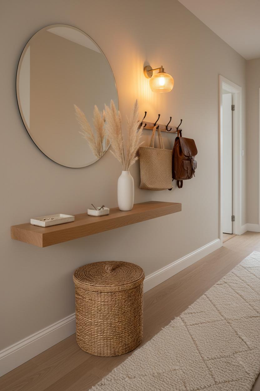 Start at the entry, because that first step sets the tone for a warm apartment aesthetic. Keep it streamlined but welcoming: a narrow console or wall shelf for keys, a small tray for mail, and sturdy hooks for everyday bags. Tuck a rattan basket beneath for shoes, umbrellas, or dog gear so clutter never piles up. A slim runner softens the floor and guides you inward, while an amber glass lamp or plug-in sconce adds a cozy glow that makes even quick exits feel calm. A simple mirror bounces light and gives you a last look before you head out, and a sprig of greenery or faux pampas grass in a neutral vase hints at the organic textures you’ll repeat throughout your space.