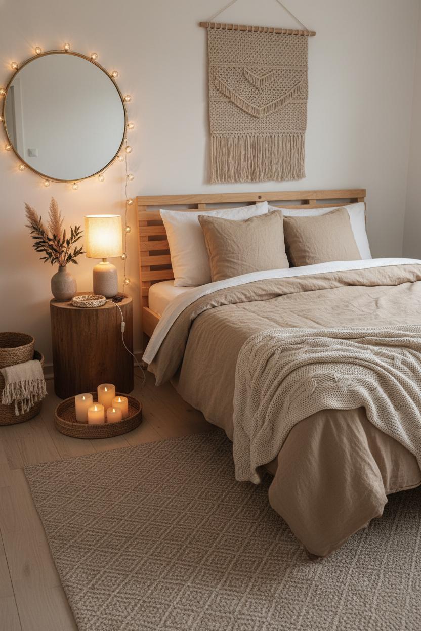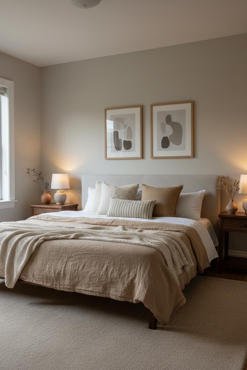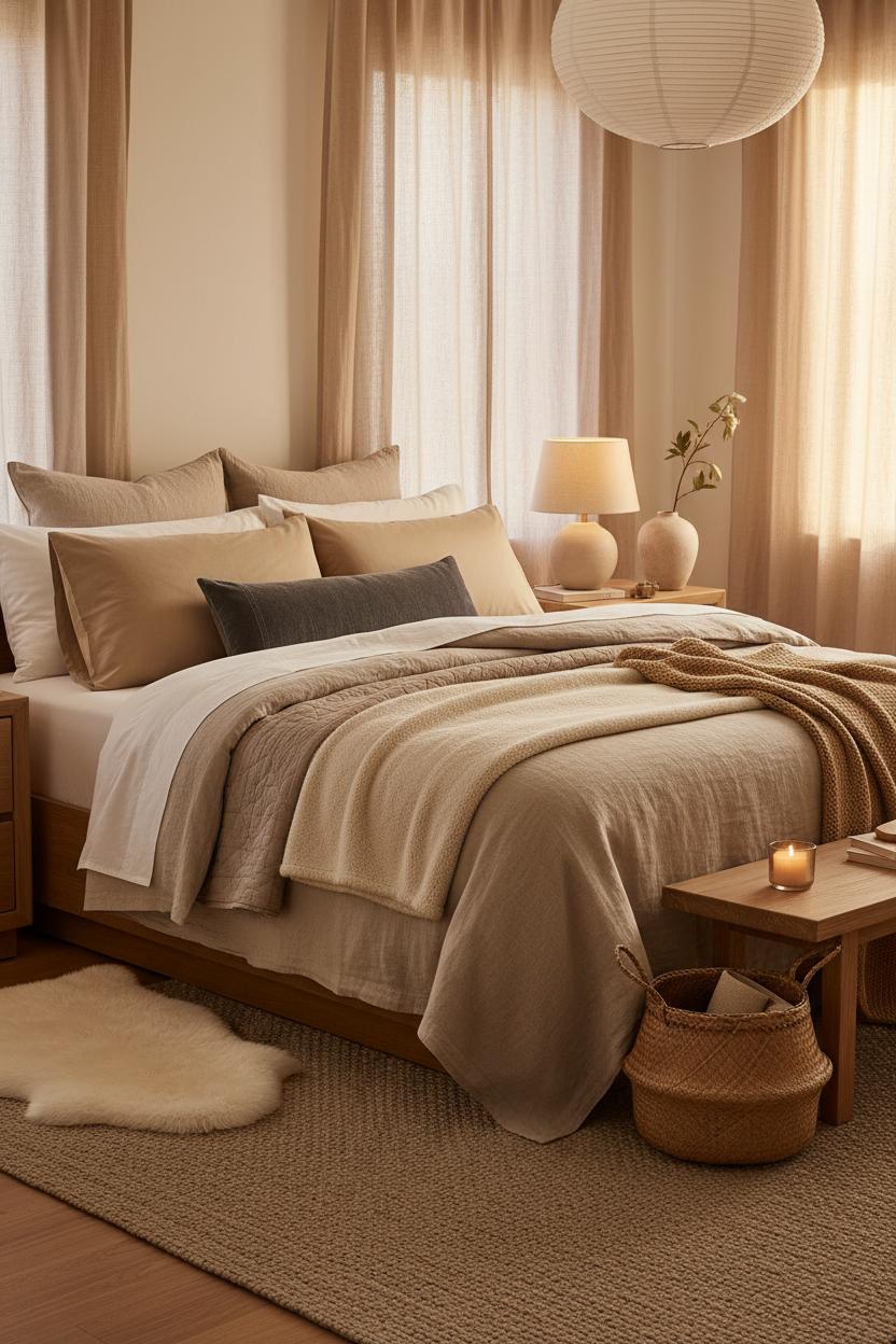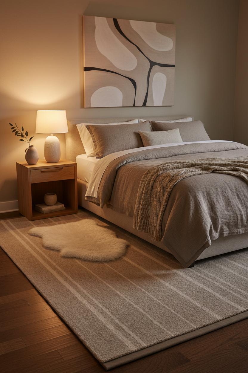 If your budget is more “weekend latte” than full makeover, start by playing with texture and tone. Keep the palette quiet and layered—think oatmeal, sand, mushroom, and soft white—to lean into neutral home decor without feeling flat. Swap a shiny comforter for a breathable linen duvet cover that looks rumpled in the chic way and gets softer with every wash. Fold a chunky knit throw blanket at the foot of the bed for that instant, touchable coziness. Underfoot, a neutral area rug with subtle pattern grounds the space and warms up bare floors, making the room feel finished even if the rest of your furniture is simple. These small, tactile changes do a lot of heavy lifting for a warm bedroom aesthetic.