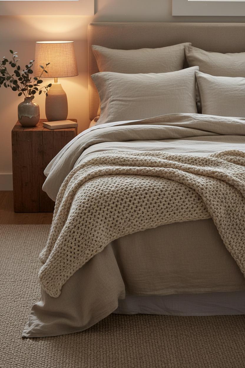 To style it, lean into gentle contrast. Think oatmeal duvet with a mushroom or clay-toned knit, or a pale stone linen paired with a warm caramel throw. Fold the blanket in thirds for a tidy hotel moment, or let it tumble for that effortless, collected feel you see on Pinterest. Add a pair of overstuffed pillows behind slimmer shams for dimension, and bring in a ceramic bedside vase with a few branches or eucalyptus to soften the lines. As the sun sets, switch on a warm LED bedside lamp to pour honeyed ambient lighting across those textures—the knit catches the light, the linen diffuses it, and suddenly the whole space glows. The result is pure hygge bedroom energy: understated, touchable, and deeply restful.