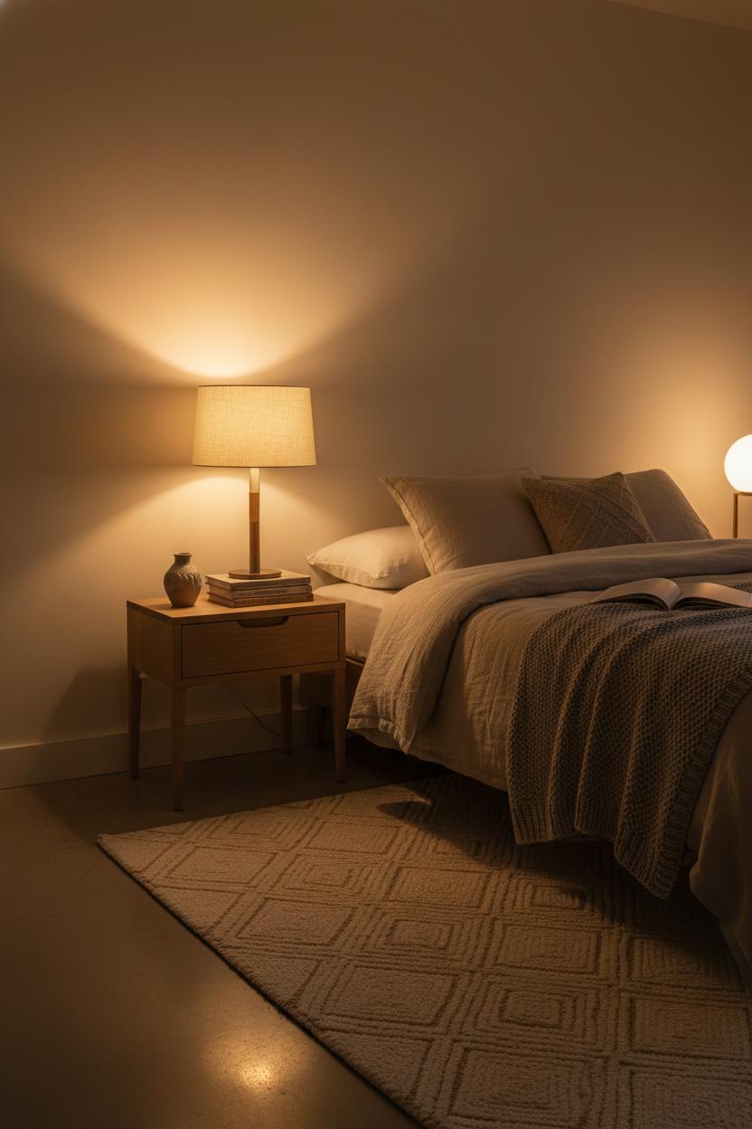 A few simple guidelines make all the difference. Look for a bulb labeled 2700K–3000K for that sunset-soft hue, and choose dimmable, flicker-free LEDs with a high CRI so colors read true. A fabric or opal glass shade diffuses light beautifully; the bottom of the shade should sit around eye level when you’re perched in bed, so pages are lit but you’re not staring into the bulb. For bedside use, 400–800 lumens is plenty—bright enough to read, soft enough to soothe. Then layer the glow: pair your warm LED bedside lamp with a low-watt floor lamp or a shaded sconce on a dimmer, and let light brush across tactile elements—a linen duvet cover, a chunky knit throw blanket, and a neutral area rug that softens the whole scene. Even a ceramic bedside vase can catch the glow in the prettiest way, adding a little shine and shape without visual noise.