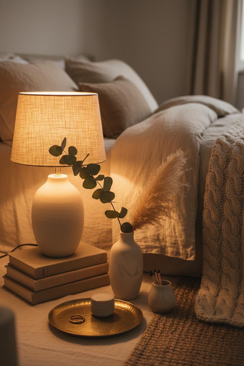 Think of your nightstand as the mood-setter for the whole space, and start with a pairing that never fails: a warm LED bedside lamp and a ceramic bedside vase. The lamp handles the ambient lighting, casting that soft, buttery glow that instantly reads calm, while the vase brings in organic shape and a little movement. Choose a lamp with a linen shade or warm-toned glass to complement a neutral home decor palette, then echo its curves with a simple vase in matte stone or glazed cream. Tuck in a single branch of eucalyptus, a dried plume, or a few seasonal blooms—just enough to add life without visual clutter. This duo anchors your vignette and creates a focal point that supports a warm bedroom aesthetic, making the room feel collected but not fussy. Stack a couple of well-loved books to vary height, slide a small tray underneath for rings and lip balm, and you’ve got a bedside scene that feels intentional and quietly luxurious.