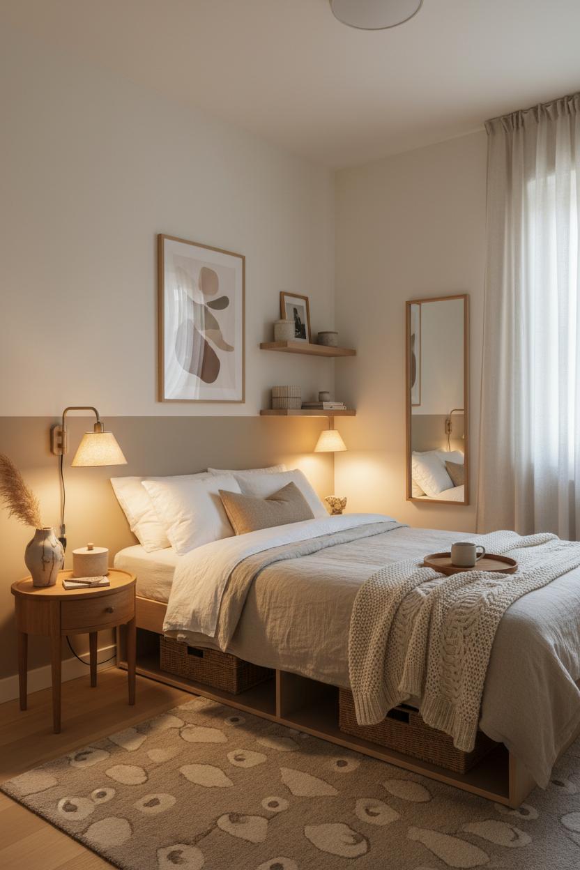 When space is tight, think of your room like a curated nook rather than a full-on suite—every choice should pull double duty for function and feel. Start with a calming base of neutral home decor: creamy whites, soft taupes, and warm mushroom tones instantly make walls recede and light bounce. Keep the bed low and inviting, then layer breathable textures that don’t feel heavy: crisp sheets topped with a linen duvet cover and finished with a chunky knit throw blanket at the foot for depth and touchable warmth. A neutral area rug that extends a bit wider than the bed cozies up cold floors and visually enlarges the footprint, especially if you choose a subtle pattern that whispers rather than shouts. Keep surfaces edited—one pretty ceramic bedside vase with a single stem reads intentional and leaves room for your nightly tea.