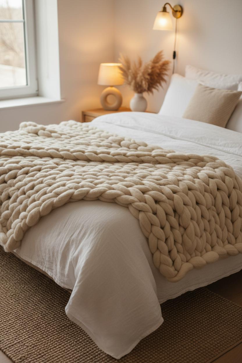 When the seasons shift, refresh your warm bedroom aesthetic with easy, tactile updates that feel intentional but effortless. Start with a chunky knit throw blanket draped over the foot of the bed—its plush, oversized weave instantly adds depth and a come-hither coziness to even the simplest setup. If you’re styling around neutral home decor, let the throw be the star against a crisp linen duvet cover, playing up that beautiful contrast of textures. Layer it near a neutral area rug to ground everything in softness from top to bottom, then echo the coziness with a ceramic bedside vase filled with dried grasses in cooler months or leafy stems in the spring. These are the cozy bedroom ideas that work year-round: keep your foundation versatile and swap in seasonal accents that change the mood without a full redesign. Think of it as a mini ritual—fold the heavier knit as temperatures drop, switch to a lighter cotton waffle when the air warms, and keep that tactile, lived-in look constant.