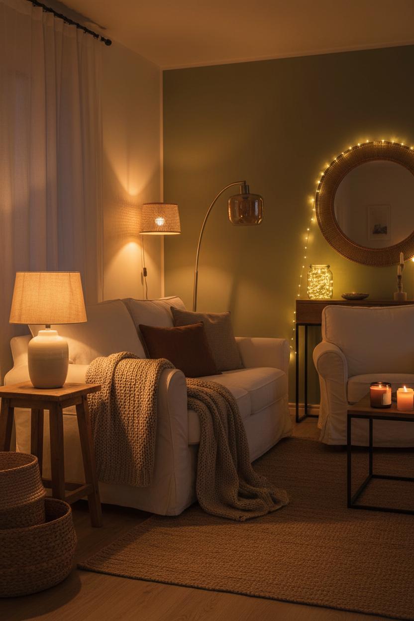 Lighting and scent are the final brushstrokes. Follow warm lighting ideas like draping LED string lights along a headboard, canopy, or bookshelf for a gentle glow, then add table lamps with linen shades and soft amber bulbs. Tuck in scented soy candles in notes of cedar, vanilla, or sandalwood to deepen the cozy vibe and make the palette feel even richer. Keep your color story tight—two to three neutrals and two earthy accents—and repeat them throughout the room so the eye can rest. The result is an effortlessly layered apartment decor look that feels grounded, welcoming, and ready for slow mornings and even slower nights.