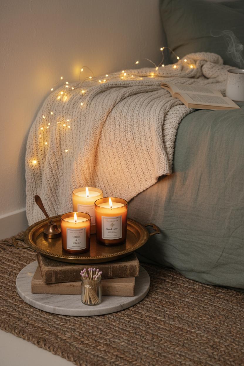 Finally, layer in glow and scent to seal the ambiance. Think warm lighting ideas like LED string lights draped loosely along a headboard, a soft table lamp with a linen shade, and a few scented soy candles grouped on a tray so the fragrance and flicker feel intentional rather than cluttered. Vary the heights of your light sources for flattering shadows and switch to dimmers if you can. Tuck a chunky knit throw at the foot of the bed for instant texture, and scatter a couple of lived-in pillows to finish the look. With these small, heartfelt details, your space becomes a gentle, welcoming retreat you’ll crave coming home to.