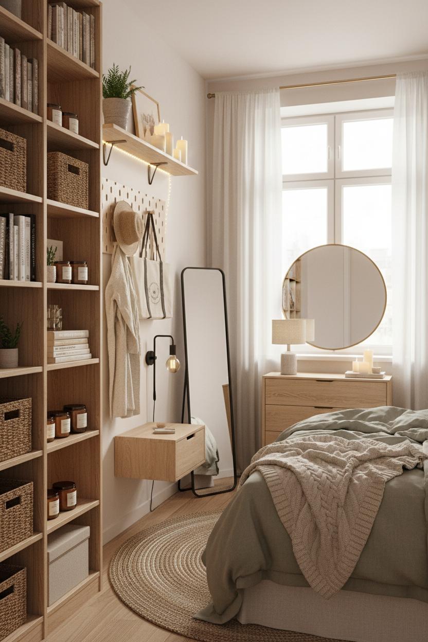 When square footage is precious, think upward. Vertical storage is the small space design secret that keeps surfaces clear and makes a room feel taller and calmer. Mount slim shelves all the way to the ceiling and style them with a balance of books, baskets, and little moments—perhaps a tiny plant or two and a row of scented soy candles for instant mood. Peg rails, wall hooks, and a tall, narrow bookcase become your best friends for bags, hats, and robes, while a floating nightstand leaves floor space open for a soft jute area rug that visually anchors the room. If you’re working with apartment decor, swap bulky bedside lamps for plug-in sconces and let LED string lights snake along a shelf or canopy for that twinkly, evening glow. Layer your bed with breathable textures—a linen duvet cover topped with a chunky knit throw—so the space feels curated, not crowded, and your hygge bedroom vibe comes through in every tactile detail.