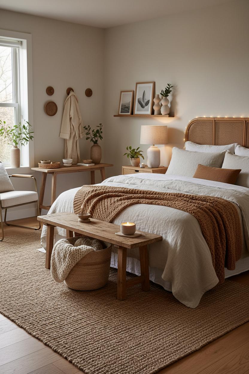 Texture is the secret to that lived-in glow, and mixing wood, rattan, linen, and ceramic is the easiest way to add instant depth to cozy room decor. Start with one grounding element—maybe a warm oak nightstand or a low, vintage-look wood bench—and let it set the tone. Layer in rattan with a lidded basket for throws, a slim cane accent chair, or a woven tray on your dresser to corral jewelry and bedtime reads. Bring softness with a breezy linen duvet cover and a chunky knit throw at the foot of the bed so the whole scene feels touchable and relaxed. A natural jute area rug underfoot adds that earthy, beachy texture that plays beautifully with wood grain, while ceramic enters as the chic, cool counterpoint: think a matte ceramic lamp base, hand-thrown planters, or a pair of sculptural vases that catch the light. This balance of hard and soft, smooth and nubby, makes even the simplest hygge bedroom feel collected and warm.