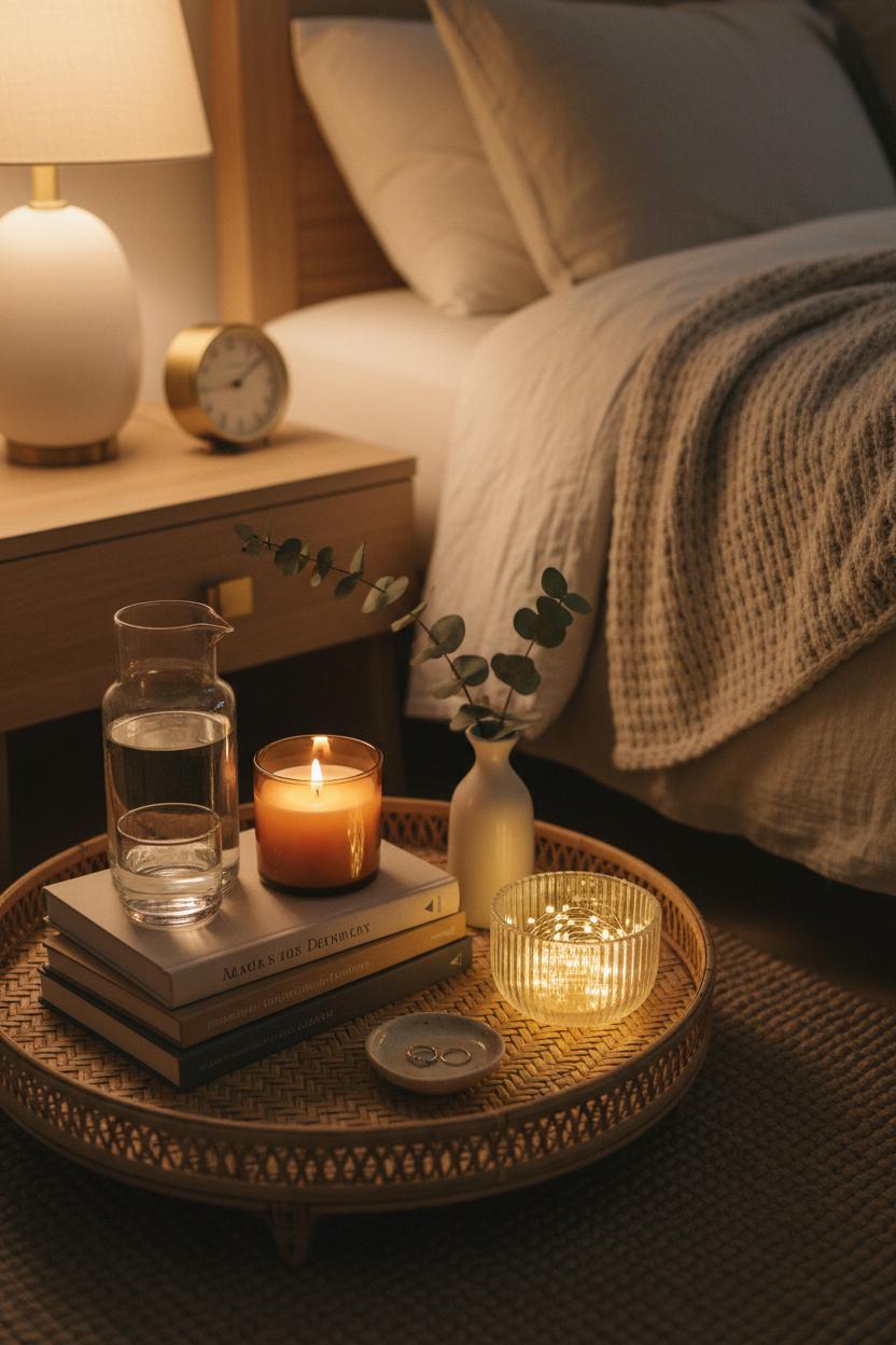 Start your nightstand with a little stage: a tray to corral the everyday and instantly make things feel intentional. A shallow rattan or marble tray anchors the scene, keeps bits and bobs from drifting, and works beautifully for small space design because it creates boundaries without adding bulk. Layer in a neat stack of favorite books—novels you actually reach for, a poetry collection, maybe a slim design tome—to add height and personality. Let the spine colors echo the rest of your cozy room decor: creamy hues that nod to a linen duvet cover, warm wood tones that play off a jute area rug underfoot, and a whisper of charcoal to ground it all. Slide in a tiny dish for rings, a carafe and tumbler for sleepy sips, and a single bud vase or sprig of eucalyptus for life and texture. A folded chunky knit throw at the foot of the bed visually softens the whole corner, tying your nightstand story back to the bedscape so the vignette feels collected, not cluttered—perfect for polished apartment decor.