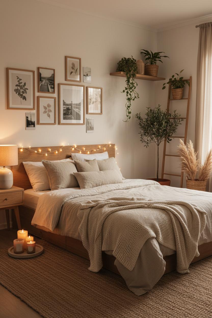 Once the big pieces are in place, the magic happens in the final cozy touches—art that tells your story, a little greenery to bring the room to life, and personal mementos that make your space feel like a warm hug. Start with the walls: layer a casual gallery of framed prints, postcards from favorite trips, vintage botanicals, and even a few Polaroids, mixing frame finishes so it looks gathered, not staged. Lean one larger piece on a dresser for an effortless feel, or place a small painting on a shelf beside your favorite books. Keep your color palette soft and cohesive so it whispers rather than shouts—think the muted tones of a linen duvet cover or the creamy neutrals of a chunky knit throw echoed in your art. The result is cozy room decor that feels curated over time and perfect for a hygge bedroom, where every glance lands on something you love.