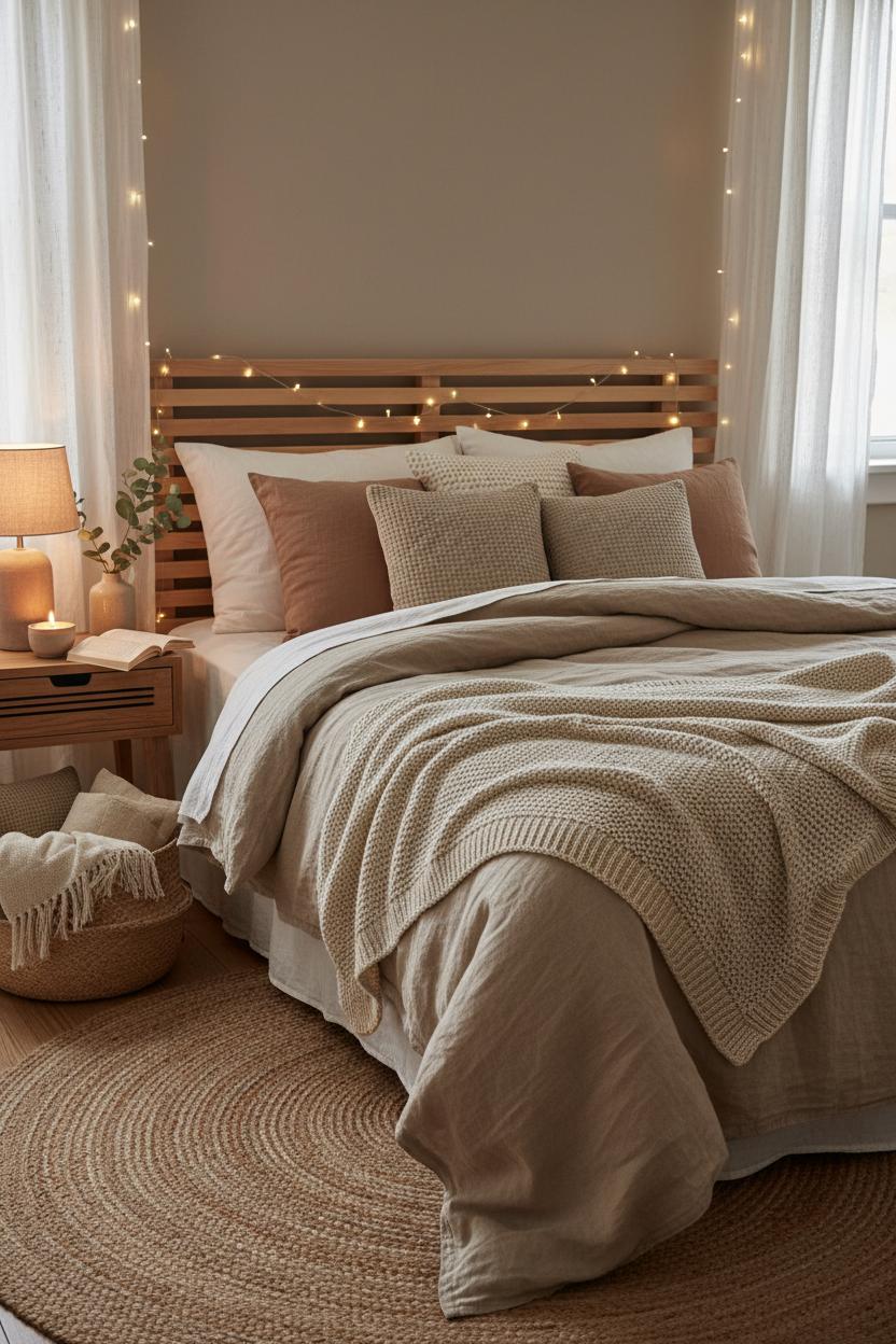 Ground the softness with natural fibers underfoot: a jute area rug peeking out from beneath the bed adds earthy texture, quietens footsteps, and anchors the whole scene—especially helpful in small space design where a single, oversized rug can make the room feel larger. Keep nightstands simple and tidy, then layer in glow and scent with warm lighting ideas that flatter every corner: drape LED string lights along the headboard or a curtain rod for a starry halo, add a small linen-shaded lamp on a dimmer, and finish with scented soy candles for that golden flicker and calming aroma. Store extra blankets in a woven basket so layers are within reach without clutter, and swap heavy patterns for subtle nubs, slubs, and fringes that play nicely together. The result is tactile and soothing—an everyday nest that feels special after a long day. In a space this considered, you don’t need much more than fresh flowers, a good book, and the hush of soft light; the layered bed does the talking, and your linen duvet cover carries the mood.
