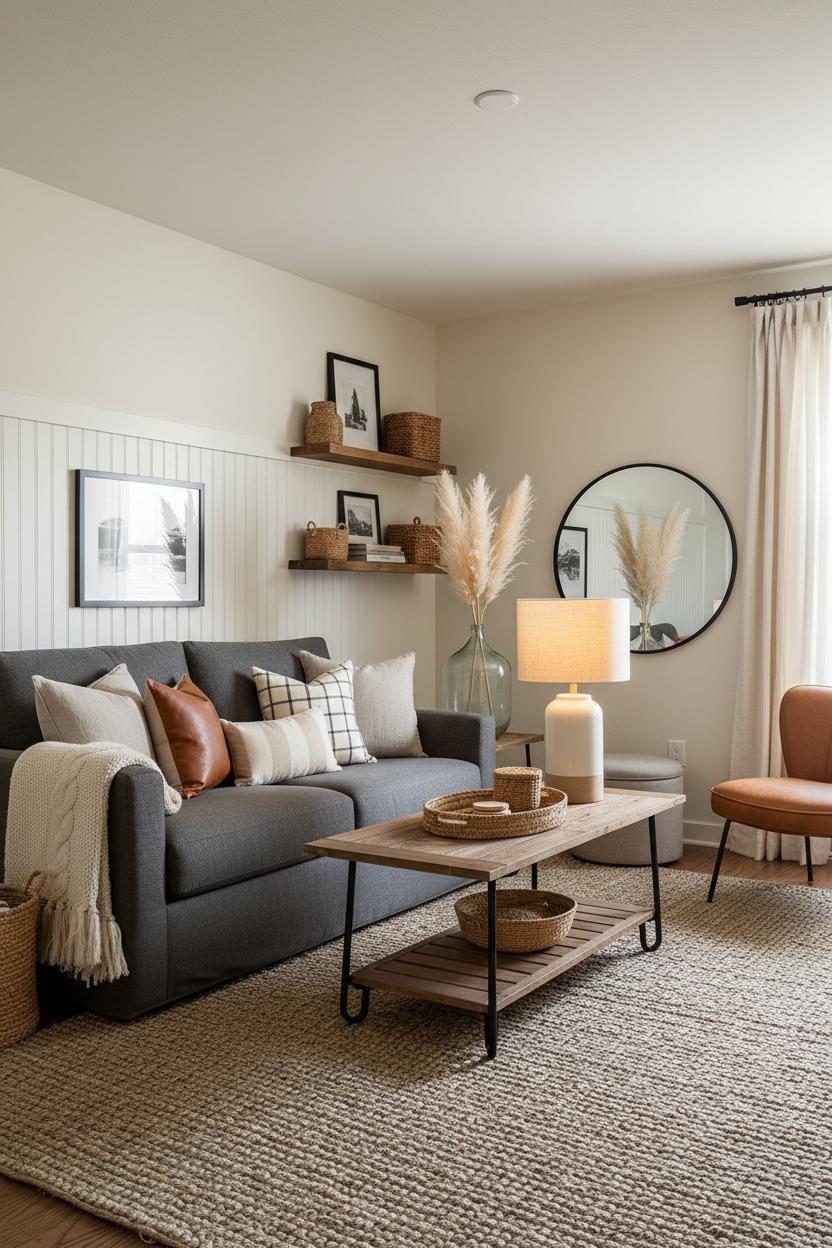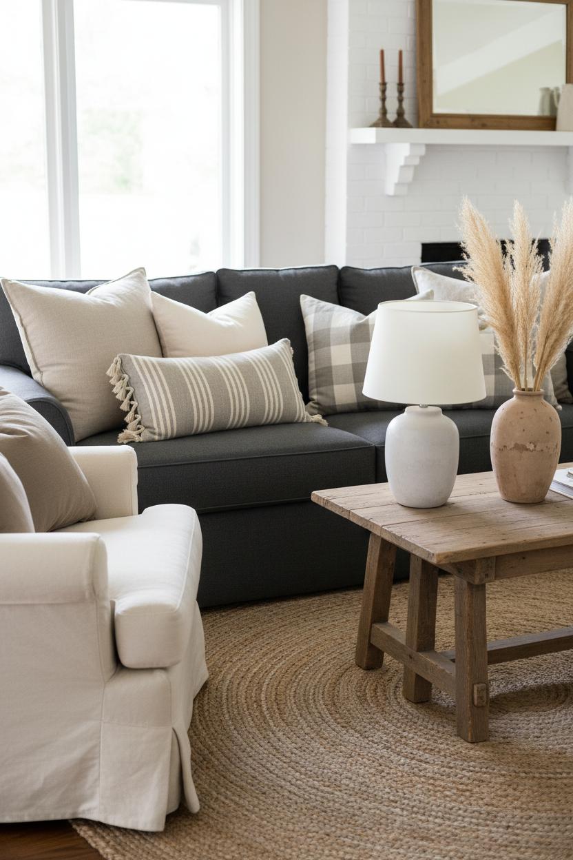 The secret to small-space living room styling is editing with intention and repeating textures so everything feels cohesive, not cluttered. Keep your palette calm—oatmeal, dove gray, caramel leather—then add just a whisper of contrast with charcoal ticking stripes or a gingham pillow. Corral remotes in a woven tray, hide blankets in a lidded basket, and swap in seasonal stems or switch out pillow covers to refresh the space without a full overhaul. With a few well-chosen layers—those linen throw pillows, the grounding jute area rug, a hardworking rustic coffee table, the warm ceramic table lamp, and a plume of faux pampas grass—you’ll have rustic living room decor that’s rental-friendly, layered with charm, and perfectly sized for cozy nights in.