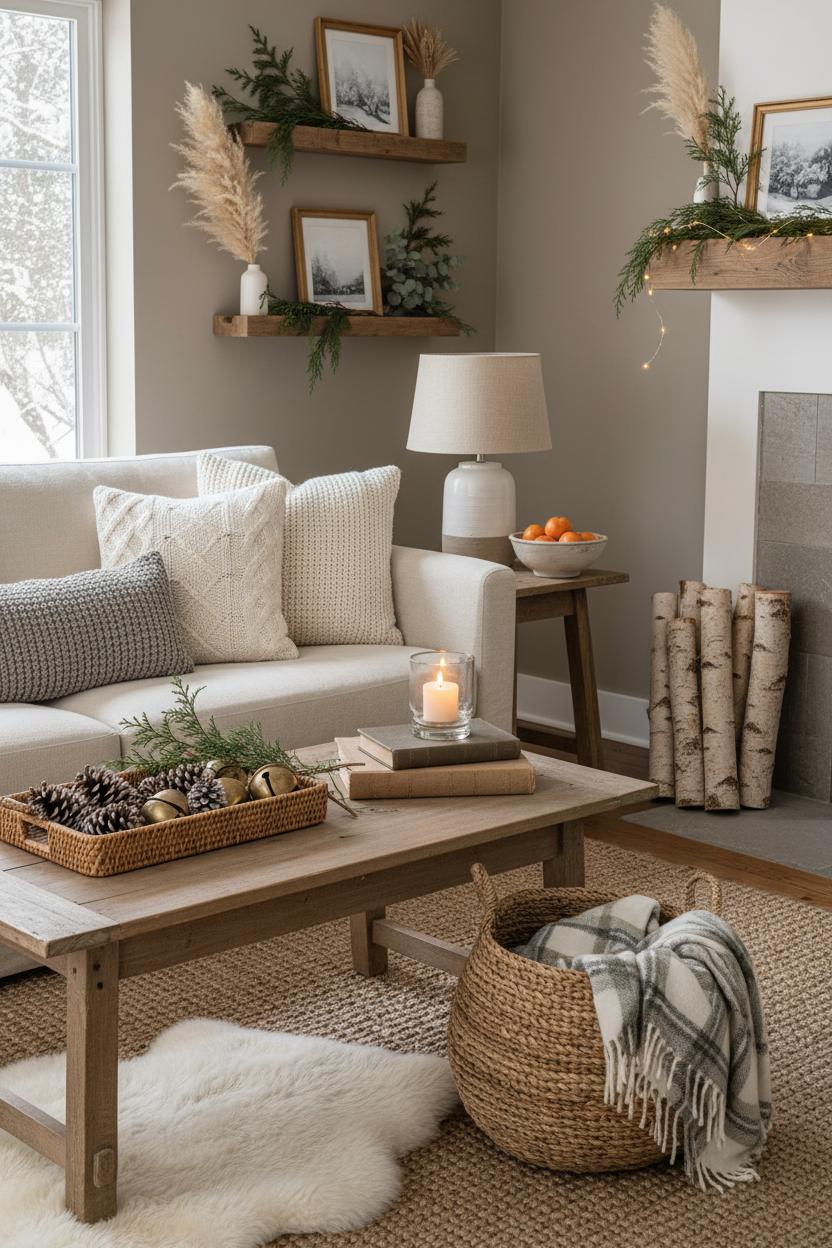 As the air shifts from crisp to snowy, think of your cozy neutral home as a backdrop that can quietly transition with the season. Keep your palette grounded in oatmeal, cream, and warm gray, then layer on texture like a pro. If your fall setup leans earthy with faux pampas grass in a stone vase and a stack of vintage books on the rustic coffee table, winter is the moment to trade a few accents for something softer and glowier. Keep the linen throw pillows you love, but slip a couple into cable-knit covers or add a nubby boucle lumbar for depth. Roll out a jute area rug to anchor the seating and slide a small wool sheepskin over it for that “toasty toes” look. Swap your amber glass candle jars for clear or ceramic, and place a ceramic table lamp with a warm white bulb at the end of the sofa so evenings feel calm and cocooned. On your tray, replace pumpkins with pinecones, brass bells, and a sprig of cedar; tuck a plaid throw into a woven basket and call it instant winter.
