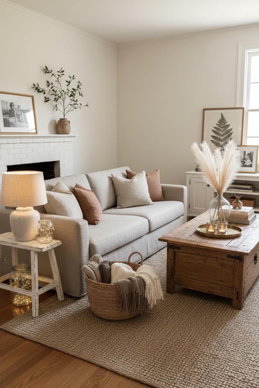 Balance is the secret. Pair an antique trunk with a ceramic table lamp for a warm, ambient glow that pools across the room at night, softening every edge and highlighting the character in your wood grains. Tuck faux pampas grass into a stoneware vessel on the mantel or coffee table to add height and that whispery, sculptural movement that photographs beautifully and never wilts. Keep your palette grounded in layered neutrals—taupes, creams, warm grays—with a hint of matte black in frames or hardware to anchor the eye. When old meets new, let textures do the talking: linen next to iron, chippy paint beside smooth ceramics, woven baskets flanking a clean-lined armchair. Edit often, repeat materials, and let each piece earn its spot. The result is a space that feels timeless yet current—a place where you can curl up, kick off your slippers onto that jute rug, and sip something cozy while the lamplight dances across vintage finds. It’s the kind of room that welcomes you in, then invites you to stay.