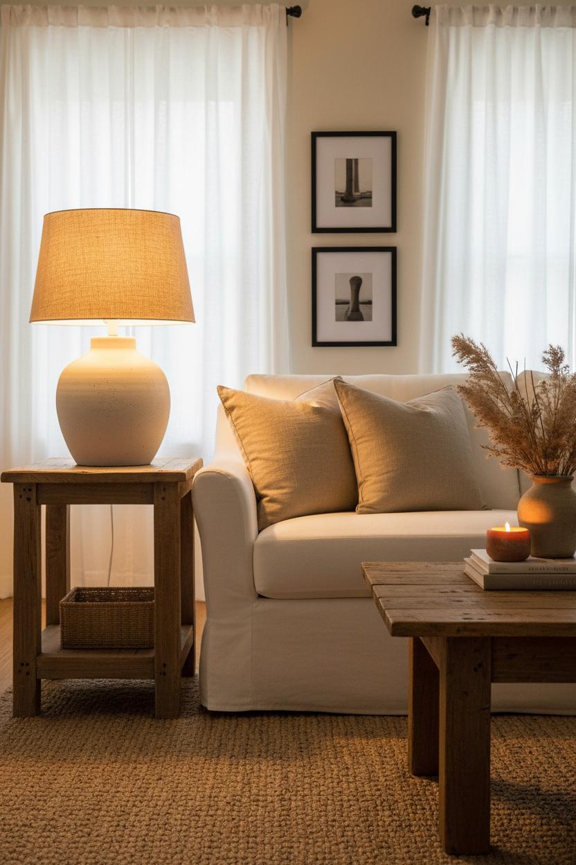 Placement is where the magic happens. A single ceramic table lamp on a wood end table can anchor a reading corner, while a pair flanking the sofa brings hotel-worthy symmetry without feeling fussy. Style it alongside a small stack of design books, a candle, and an earthenware vessel filled with faux pampas grass for height and softness that nods to the outdoors. Underfoot, a chunky jute area rug grounds the space with natural texture, and a rustic coffee table—think knotty pine or weathered oak—becomes the center of casual gatherings. Layer in linen throw pillows in oatmeal, stone, and warm greige for that cozy neutral home palette that never fights the light; instead, it bounces it around the room in the prettiest way. If your heart leans modern farmhouse style, mix in a hint of black metal in curtain rods or picture frames to sharpen the look while letting the ceramic stay the star. The result is living room styling that feels curated yet effortless, where every evening settles into a golden hush and the lamp becomes less a fixture and more a ritual—click, glow, exhale.
