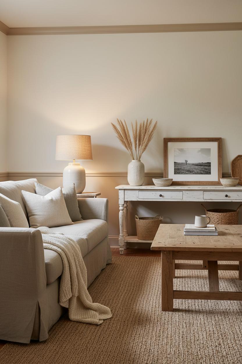 From there, pile on tactile layers that whisper rather than shout. Linen throw pillows in oat, cream, and soft greige instantly soften the room and invite lounging, while a jute area rug grounds everything with an earthy, barefoot-friendly foundation. A rustic coffee table in reclaimed wood becomes the heart of your seating area, its patina balancing newer pieces with quiet history. For lighting, a ceramic table lamp with a warm linen shade casts that golden, cozy glow you crave after dusk. Tuck a vase of faux pampas grass on a console or mantel for height and movement—its feathery texture keeps the look organic without competing with your palette. This is rustic living room decor refined: simple, layered, and unfussy. If you love modern farmhouse style, mix clean-lined silhouettes with nubby textiles and vintage-inspired finishes for balance. When it comes to living room styling, repeat your core tones in different textures—woven baskets, stoneware, a raw-edge wood frame—so the room feels collected, not cluttered. The result is a space that’s quietly luxurious, endlessly versatile, and ready for every slow evening at home.