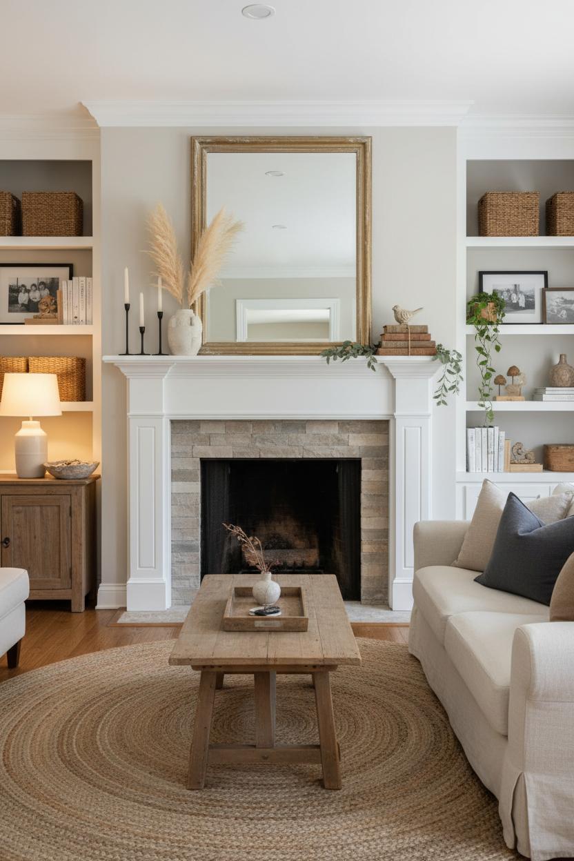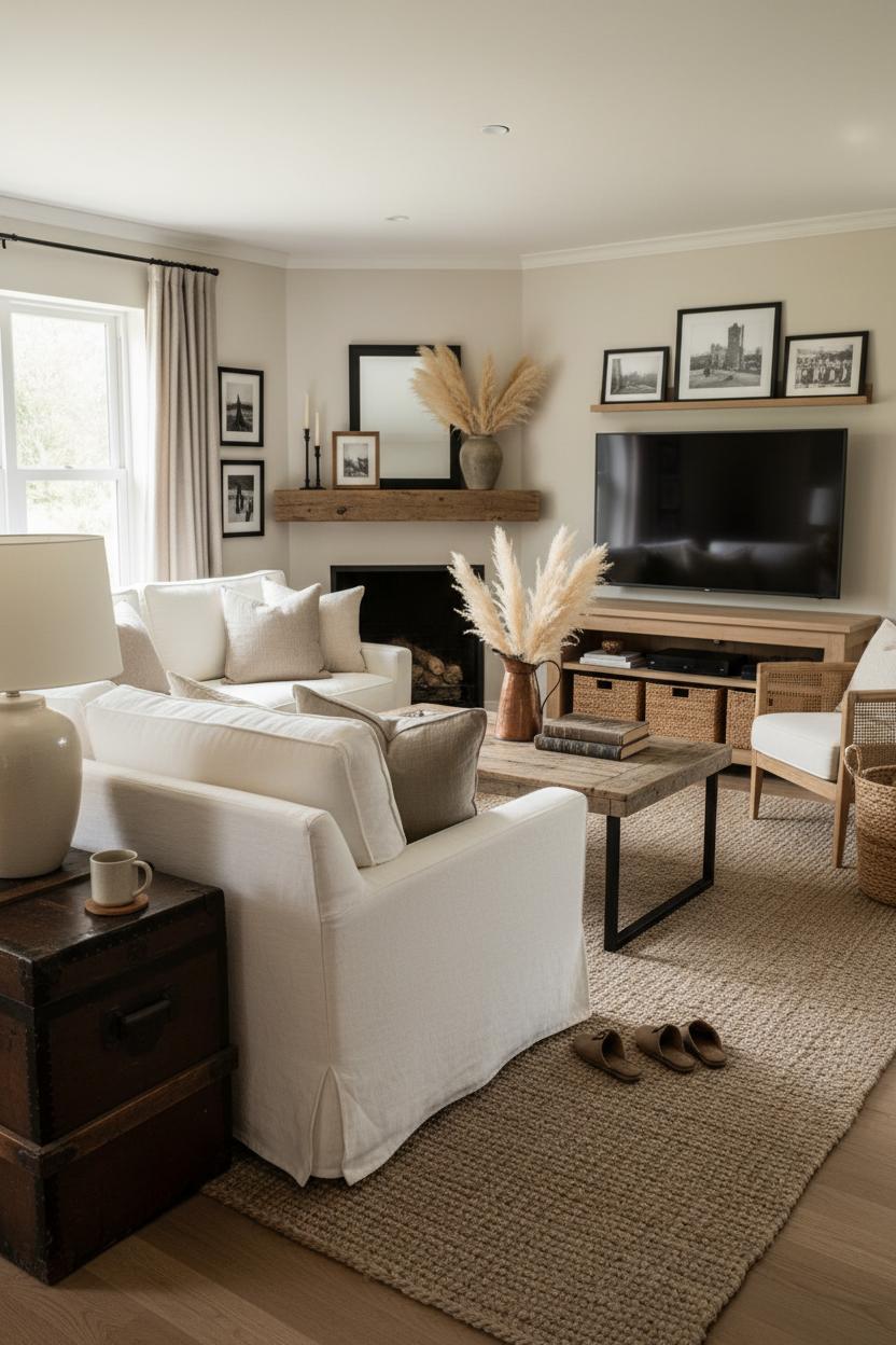 On shelves and sideboards, aim for a rhythm of height, texture, and negative space. Mix closed baskets with open stacks of books, tuck in a couple of framed family photos, and repeat finishes so everything feels cohesive. A sculptural bowl on the sideboard corrals keys and remotes, while a softly glowing ceramic table lamp casts those flattering pools of light that make evenings feel extra cozy. If your shelves feel flat, weave in woven textures and a touch of greenery, then echo those tones across the room—a jute area rug underfoot, linen throw pillows on the sofa, and a rustic coffee table layered with a wooden tray and a tiny bud vase. That repetition pulls the whole space into a cozy neutral home palette without losing the charm of modern farmhouse style. Keep your colors quiet—creams, oatmeal, warm woods, and a whisper of charcoal—then let patina and plushness do the talking. Corral small items on trays, hide extras in lidded baskets, and let one or two statement pieces shine rather than crowding every surface. With thoughtful living room styling that balances function and beauty, your shelves stay purposeful, your sideboard works as a hardworking hub, and your mantel becomes the heartbeat of the room—ready for candlelit, curl-up-on-the-couch nights.