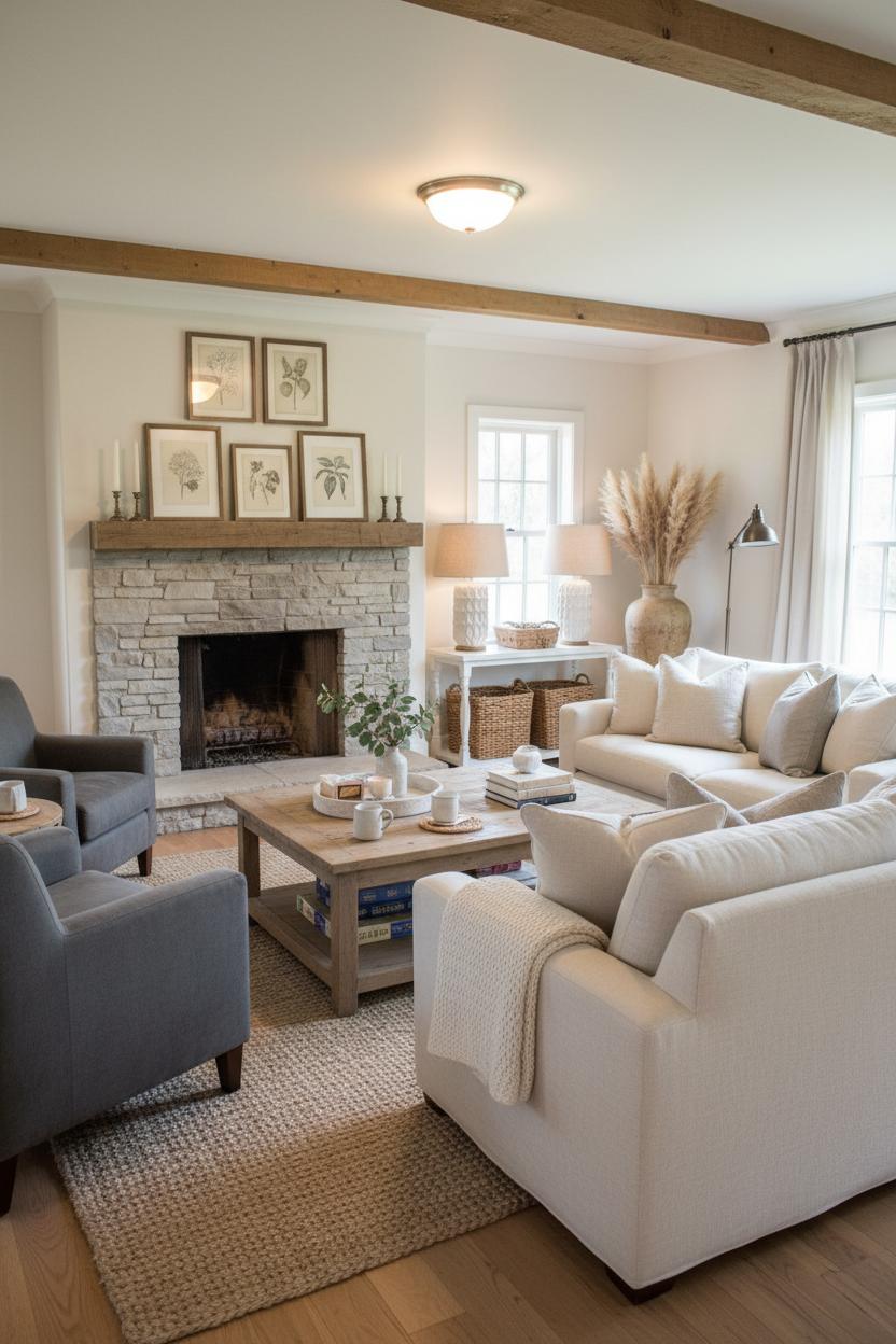 If your room is long, try two smaller seating clusters instead of one big arrangement: a compact sofa and chair set near the fireplace, then a pair of accent chairs by the window for a reading perch. In a square room, an L-shaped sectional with a pair of swivels keeps the layout fluid and lets you pivot toward conversation or the view. For flexible seating, tuck two upholstered cubes under the rustic coffee table or slide a skinny bench beneath a window. Build a lighting triangle so faces glow at night: a ceramic table lamp beside the sofa, a floor lamp behind a chair, and a soft overhead on a dimmer. A tall bundle of faux pampas grass in an earthenware vase adds height and a whispery layer that feels right at home in a cozy neutral home. The magic of modern farmhouse style is the mix—clean-lined silhouettes with lived-in finishes—so keep your palette warm and simple, then play with contrast through wood tones, metals, and woven baskets. Finish with thoughtful living room styling: a tray of matches and candles, stacked books, a sprig of greens, and coasters at the ready. Suddenly, the room says, “Come sit,” and every seat is the best seat in the house.