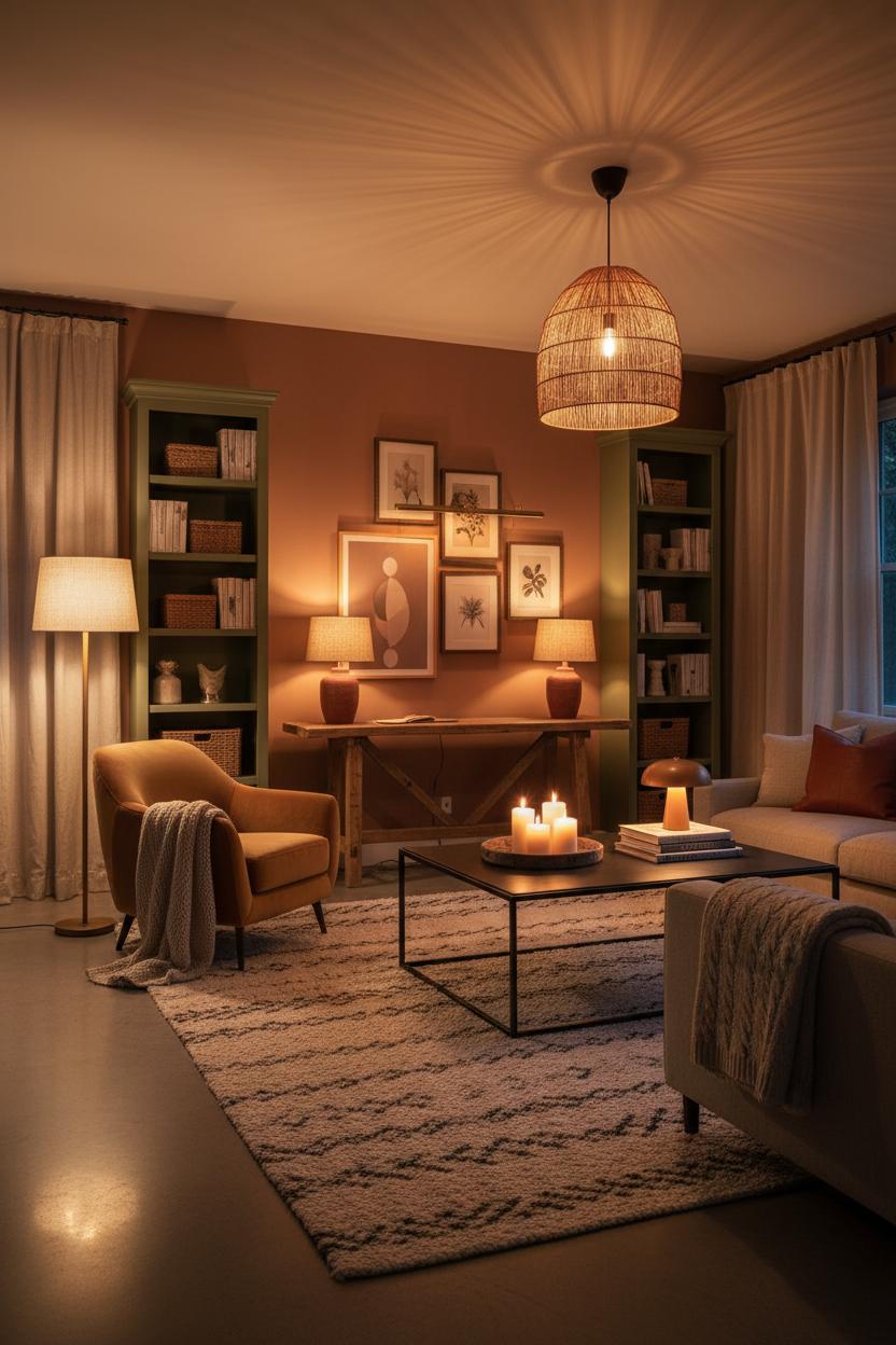 If you want a warm living room that instantly feels like a hug, start with layered lighting—the art of mixing different light sources so every corner glows just right. Think of your ceiling fixture as the sunset, setting the overall mood with soft, dimmable warmth, and then add pockets of light where life actually happens. A reading chair gets its own glow from an LED floor lamp with a linen shade, a console feels chic with a pair of small table lamps, and a favorite art print or bookshelf can shimmer under a picture light. Balance the brightness with earthy tones—clay, camel, rust, olive—so the light bounces off soft textures rather than stark white walls. Keep the vibe soothing by opting for warm bulbs and diffused shades, and tuck a candle set unscented on a tray for that flicker without competing fragrances. It’s one of those cozy decor ideas that looks effortless but feels meticulously layered.