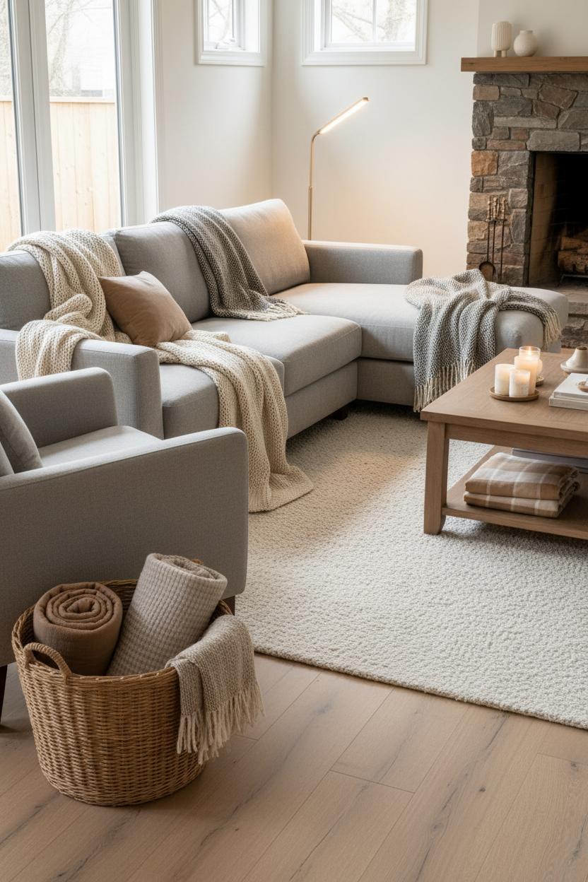 When you want instant coziness without a full redesign, neutral throw blankets are the quiet heroes of a warm living room. Think of them as wearable décor—soft layers that you can drape, fold, and stack to add depth and comfort in seconds. Choose a palette of earthy tones like oatmeal, camel, mushroom, and greige to blend seamlessly with what you already own, whether your style leans modern farmhouse or minimal and airy. Mix textures the way you’d mix jewelry: pair a chunky knit with a smooth linen blend, a nubby bouclé with a ribbed cotton. Toss one casually over the sofa arm, fold one crisp across the back of a chair, and roll a couple into a pretty basket by the hearth. The result is that collected, lived-in vibe that makes guests want to sit and stay—exactly the kind of cozy decor ideas that make a space feel welcoming on busy weeknights and slow Sundays alike.