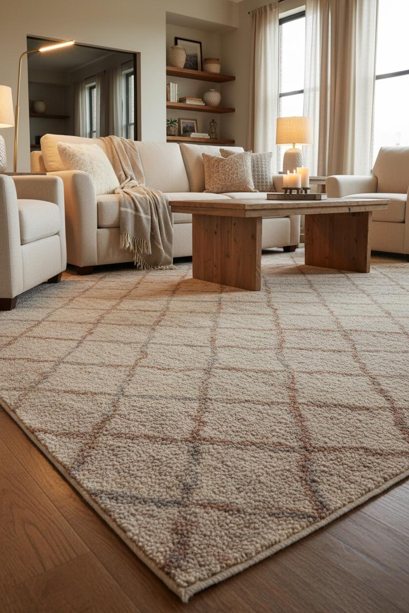 Start from the ground and let the room bloom upward. A generous area rug plush enough to invite bare feet instantly softens the architecture and makes a seating zone feel intentional, not accidental. In a warm living room, that cushy layer acts like a hug for the whole space, absorbing echo and bringing in a tactile coziness you notice the second you step in. Choose earthy tones—think oatmeal, clay, stone, or a heathered mix—to echo nature and bridge styles, from modern farmhouse to city loft. Float a sturdy wood coffee table on top so the textures can play off one another, and then echo the palette across the sofa with neutral throw blankets that beg to be gathered for movie night. Pattern works beautifully here, but let it whisper: a subtle stripe, a vintage-inspired medallion, or a tonal Moroccan trellis will add depth without shouting over your other cozy decor ideas.